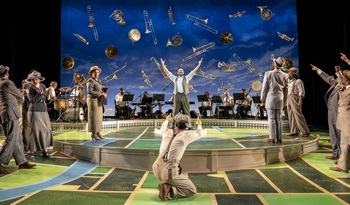 Co-directors Michael Baron and Sandra Mae Frank, hearing and deaf respectively, have worked with a talented cast that brings together hearing performers with those with varying levels of hearing loss, allowing for a truly bilingual experience. The first evidence that this isn't just another production of The Music Man comes in the opening scene, "Rock Island," a rhythmic spoken-word piece (proto-rap?) showing an argument among traveling salesmen underscored by the sounds of a moving train. In Karma Camp's ingenious choreography, the Conductor (Florrie Bagel) speaks most of the lyrics while the rest of the cast, representing the passengers on the train, follow her in a cluster formation and toss in a few words here and there. In this production's version of River City, Iowa, there is no demarcation between the hearing and non-hearing worlds. Mayor George Shinn (Andrew Morrill) uses sign language to deliver his pompous pronouncements, and his social-arbiter wife Eulalie (Amelia Hensley) similarly dominates the town's discourse through signing. Marian Paroo (Adelina Mitchell), librarian and piano teacher, speaks and sings eloquently; her mother Mrs. Paroo (Nicki Runge) and young brother Winthrop (Christopher Tester) primarily sign. Winthrop's silence also comes from the fact that, as in the original, the character is embarrassed by his lisp. Some hearing cast members provide vocals for characters played by deaf performers: James Caverly, the captivating actor who drives the plot as Professor Harold Hill, performs his songs in American Sign Language while Vishal Vaidya, who plays Hill's sidekick Marcellus Washburn, sings Hill's songs. Two of the four actors who famously form a barbershop quartet act their roles while being voiced by other cast members. The supertitles help bring out some of Willson's verbal humor that doesn't translate directly into signing. On the other hand, some of the most moving moments are unspoken, depicted purely through sign with the text appearing above. To accommodate the large and active cast, the physical production is simple. Ethan Sinnott's scenic design suggests a map of a small town, with a curved ramp at the rear leading to a raised circular platform in the center; individual set pieces move easily, carried by cast members. The spirited 10-piece orchestra, conducted from the piano by Christopher Youstra, is in view on a "bandstand" upstage, underneath a vividly lit cyclorama depicting the sky (lighting design by Jesse W. Belsky). Rosemary Pardee's costumes range from the everyday to the whimsical, such as the "ancient Greek dancers" wearing togas clearly made from bed sheets. The Music Man runs through July 24, 2022, on the mainstage at the Olney Theatre Center, 2001 Olney-Sandy Spring Road, Olney MD. For tickets and information, please call 301-924-3400 or visit www.olneytheatre.org. Book, music, and lyrics by Meredith Willson Cast: |