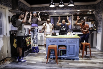 Director Steve H. Broadnax III, who also directed the world premiere of the play in New York City (with a different cast), has established a close rapport with not only the playwright but also his six totally committed actors. They work together smoothly and, even when events onstage seem a bit over-the-top, their performances keep everything real. Cordell (Brian Marable), leader of the New Wing Order team, is determined to win this year's hot wing contest, going on and on about fine-tuning the ingredients in the marinade and the role of experimentation in the seasoning process. (His latest brainstorm is "Cajun Alfredo wings with bourbon-infused crumbled bacon.") Joining him are his partner Dwayne (Blake Morris); barber Big Charles (Bjorn DuPaty), in whose shop Cordell and Dwayne met; and Big Charles' partner Isom (Michael Kevin Darnall), a young New Orleans transplant with a serious attitude and hair dyed aqua. Dwayne's shifty brother TJ (JaBen Early) and his son Everett, or EJ (Derrick Sanders III), also show up during the long night and early morning of hot wing preparation. Hall's slice-of-life approach examines several issues facing Black gay men. Cordell was living in St. Louis with a wife and two children when he met Dwayne during a work trip to Memphis and finally felt comfortable coming out. Now he dreams about starting his own wing restaurant, which likely won't happen unless he wins the contest. Meanwhile, as Cordell tries to marshal the troops to get the wing process going (the choreographed prep routine is delightful), Big Charles would rather watch a basketball game. Everett wants to live with Dwayne and Cornell rather than his feckless father; he's coping with family trauma and irresponsibility, while Isom keeps trying to get attention. The cast has no weak links. Marable and Morris have created the easy, slightly prickly rapport between people determined to build a life together while navigating the obstacles they face; Darnall steals focus whenever he's onstage; DuPaty serves as the grounding presence of the group; Early is charming enough to let people overlook some of his more toxic qualities; and Sanders is both sweet and moving as a young man forced to grow up too soon. Michael Carnahan's modular scenic design depicts Dwayne and Cornell's house in thorough detail, from the rainbow-hued row of storage jars on a kitchen shelf and the elaborate workspace in the middle of the kitchen, to the print on the guest bedroom wall, to the upright piano in the living room. Ivania Stack's costume design visually frames the personality of each man, ranging between hoops fanatic Big Charles' Memphis Grizzlies jersey and fashionable Isom's artfully cropped shirt and distressed jeans. In addition to Alan C. Edwards' lighting design and Curtis Craig's sound design, props designer Amy Kellett has gathered a dizzying amount of scenic detail, from cookbooks to photos and notes posted on the refrigerator. The Hot Wing King runs through July 31, 2022, in the Victor Shargai Theatre at Studio Theatre, 1501 14th St. NW, Washington DC. For tickets and information, please call 202-332-3300 or visit www.studiotheatre.org. By Katori Hall Cordell: Brian Marable |