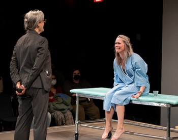 The disorientation begins when the curtain rises on Debra Booth's set and the viewers realize they are facing another section of the audience, with a narrow stage located in between (a configuration only possible in the totally flexible Victor Shargai Theatre). This constriction of space challenges crew members to stay on top of their scenery shifts and lighting cues, not to mention keeping up with the projections and media designed by Alex Basco Koch and original music and sound design by Lindsay Jones. The audience first sees Emma (Kristen Bush) having a breakdown while performing Anton Chekhov's The Seagull (the theater in-jokes are a bonus). She powers herself with alcohol and various drugs, but the rush she gets from performing also comes across as a form of addiction. "If I'm not in character, I'm not sure I'm alive," she tells a doctor (Jeanne Paulsen). Director David Muse confidently brings together the naturalistic and hallucinatory elements of Macmillan's play. On one level, Emma finds her way to a rehab center and gradually accepts that she needs to stop isolating herself and participate in a therapy group. On another, she contends internally with alternate images of herself (played by cast members in look-alike costumes and wigs) and her mental images are projected onto the walls of the set. Aside from Bush, whose performance shows an almost scary level of commitment to the role, the other cast members each play more than one character. Standouts include Nathan Whitmer as an orderly who becomes Emma's friend; Jahi Kearse as a patient learning to break out of old life patterns; and David Manis as an older patient with personality issues. Andrew Cessna's lighting design adds to the overall sense of disorientation, while Helen Q. Huang's costumes range from scrubs for the rehab staff to character-defining pieces for Emma and the other patients. People, Places & Things runs through December 11, 2022, in the Victor Shargai Theatre at Studio Theatre, 1501 14th St. NW, Washington DC. For tickets and information, please call 202-332-3300 or visit www.studiotheatre.org. By Duncan Macmillan Emma: Kristen Bush |