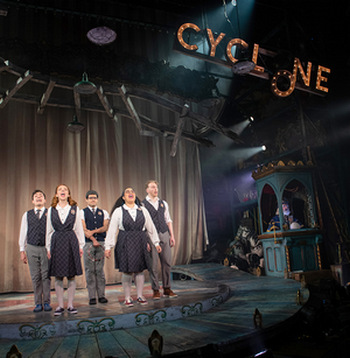 Jacob Richmond and Brooke Maxwell created the book, music, and lyrics for this work, which follows the post-earthly lives of six high school students as narrated by a mechanical but apparently sentient fortuneteller (Marc Geller). They are members of a high school choir in Uranium City, Saskatchewan (population 91 in 2021, according to Wikipedia), who had stopped on their way to a performance to ride the rickety Cyclone rollercoaster at a seedy roadside carnival. It isn't a spoiler to note that the coaster flies off the rails, killing all aboard. The Amazing Karnak (Geller) explains to the audience that his powers include predicting times and places of death for the people who interact with him. In this case, he's offering one of the six a chance to return to life, but all of them must agree on which one that should be. They are domineering Ocean O'Connell Rosenberg (Shinah Hey), overachieving daughter of hippie parents; Constance Blackwood (Gabrielle Dominique), who lives in Ocean's shadow and puts up with her condescending "friendship"; Noel Gruber (Nick Martinez), the only out gay boy in town and a devotee of Samuel Beckett and Marlene Dietrich; Mischa Bachinski (Eli Mayer), adopted from Ukraine (the action takes place in 2009, long before the current fighting there); Ricky Potts (Matthew Boyd Snyder), who is virtually mute until he gets to speak for himself; and the spectral Jane Doe (Ashlyn Maddox), unidentified because she was decapitated in the crash. Maddox wears makeup and a wig to approximate the look of a doll's head, complete with cotton candy-like hair. Richmond and Maxwell display their familiarity with numerous genres of music as each character shares her or his story. Ocean is a pop diva who leaves nothing to chance; as Constance confides, Ocean even scripts her improvisational moments. Noel shares his fantasy of being a French prostitute (a woman) driven to destroy both herself and the men who love her. Mischa starts out as an Auto-Tuned rapper before proclaiming his love for an idealized young woman waiting for him in Ukraine. Ricky's fantasy life, nurtured through his love for comic books, involves ruling a planet inhabited by humanoid cats. Jane sings a sad coloratura aria as she floats about the stage. Constance gets the last word, about how things don't have to stay the way they always were. They, and pompous Karnak, are all fully committed to their roles and fascinating to watch and hear. Director Sarah Rasmussen and choreographers Jim Lichtscheidl and Tiger Brown use every inch of Scott Davis' purposefully cluttered set, illuminated by Katherine Freer's ingenious video projections and Jiyoun Chang's lighting design. Trevor Bowen's costumes are both inspired and silly as need be. Music director Nick Wilders and four other musicians (one of whom appears in a rat costume–it makes sense in context) show their skill in genres from French chanson to hip-hop and opera. This production is a partnership between Arena and the McCarter Theatre Center of Princeton, New Jersey. Ride the Cyclone runs through February 19, 2023, in at the Mead Center for American Theater, Kreeger Theater, 1101 6th St. SW, Washington DC. For tickets and information, please call 202-488-3300 or visit www.arenastage.org. In association with McCarter Theater Center Cast: |