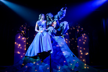 As with most of Synetic's performances, most of the performers do not speak, conveying the story through astonishing physical feats with elements of mime and acrobatics, enhanced with surreal shadow images behind a large screen. A narrator, Emmeranne (Rachael Small), sets up the story–how she turned the handsome prince she loved into the hideous Beast as revenge for his family's destruction of their love–and remains an insinuating presence throughout. Tsikurishvili has lost none of his ability to dominate the stage. Costumed in armor of fur and leather, he manages to defy gravity at times while also flinging himself from raised platforms. As Belle, Irina Kavsadze, also from the original production, holds her own against such an overpowering character. She is sensitive without being cloying, kindhearted and never maudlin, and demonstrates a deep courage based in empathy as she realizes that the Beast is not what he seems to be. The ensemble slides easily among roles, as Belle's spoiled sisters (Nutsa Tediashvili and Irene Hamilton) at times become part of the corps of human statues serving the Beast in his castle. Original costume designer Kendra Rai, and Delaney Theisz who costumed this production, depict the servants in skin-tight suits the color of dusty granite. Other eye-catching outfits are Small's tattered black dress and large shawl (Emmeranne can transform herself into a crow); the vivid red shirt worn by Avenant (Jacob Thompson), who futilely pursues Belle and ignores her two sisters; and the costuming in a scene when the ensemble members turn into a pack of wolves. Beauty and the Beast runs through April 2, 2023, at Synetic Theater, 1800 S. Bell St., Arlington VA. For tickets and information, please call 866-811-4111 or visit www.synetictheater.org. Co-Directed by Ben Cunis and Vato Tsikurishvili Cast: |
