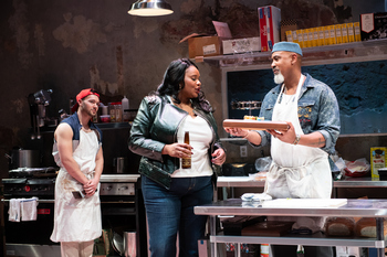 Junghyun Georgia Lee has created a surprisingly roomy set in Studio's endlessly flexible Victor Shargai Theater, with seats on three sides. This is the rather scruffy-looking industrial kitchen where senior sandwich maker Montrellous (Thompson) mentors Letitia (Kashayna Johnson), Rafael (Brandon Ocasio), and new hire Jason (Quinn M. Johnson) while regularly butting heads with shop owner Clyde (Batteast). Clyde only hires formerly incarcerated people, knowing they have few other options. The primary conflict is between the preternaturally calm Montrellous–as one of his co-workers says, "He's like the Buddha if the Buddha grew up in the 'hood"–and the petty tyrant Clyde. He sees creating food as a form of mindfulness, filled with respect for the ingredients and indignation over, for example, adding pickle relish to a sandwich that doesn't need it. Clyde, on the other hand, just wants sandwiches made quick and dirty, with no artistry. Batteast has a deceptively sweet face, but she never hides the glee Clyde takes in abusing her employees. She dresses to intimidate (hers are the standouts among Danielle Preston's costumes) and she can get away with reminding her employees that they are there to work, not to join in Montrellous' dream of creating the perfect sandwich. Thompson, meanwhile, gives a hypnotic, mostly soft-spoken performance as mentor to the younger employees: outspoken Latino Rafael (Ocasio); exhausted single mother Letitia (Kashayna Johnson); and Jason (Quinn M. Johnson), the only white employee, who is trying to outrun the shadow of the violent act that sent him to prison. Another highlight of Nottage's play is how quotable it is. Most of these are Montrellous' statements of purpose, such as "You're disrespecting the lettuce" and "We leave the pain in the pan," and his description of the sandwich as "the most democratic food," since anything can go between two slices of bread. One special note: this production must be one of the few to employ a sensory consultant. Miriam Songster uses essential oils and the scents of actual cooking to make the audience members feel (on a subliminal level) that they're working alongside the characters. Clyde's runs through April 9, 2023, at Studio Theatre, Victor Shargai Theatre, 1501 14th St. NW, Washington DC. For tickets and information, please call 202-332-3300 or visit www.studiotheatre.org. By Lynn Nottage Clyde: Dee Dee Batteast |