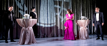Director Trip Cullman and his four actors take a heightened, satiric approach as the play follows the clash between Katie (Karoline), author of a best-selling work of popular history, and Harry (Josh Stamberg), a know-it-all television producer who has optioned her book as a miniseries. The topic is the Chinese Exclusion Act, a U.S. law passed in 1882 that prohibited the entry of all Chinese people; the law was not repealed until 1943 and a strict quota on Chinese immigrants remained in force until 1968. While Katie wants the miniseries to focus on her research into the true stories of Chinese immigrants during that period, Harry wants to juice it up, arguing that something can be "emotionally true" without being factually correct. If that means rewriting the history of a mass lynching of Chinese men or changing a major character's profession from a seamstress to a sex worker, he wants to broadcast what sells, not be tied to actual events or telling stories that haven't been heard. The other characters are Malcolm (Tony Nam), Katie's husband, doing his best to be supportive and prepared to help her if he can, and Viola (Michelle Vergara Moore), an Australian-Asian movie star who befriends Katie after being cast in the series. Lin takes them all through several reversals, leading to a satisfying if cynical resolution. The drama revolves around Katie, which means that Karoline has to carry the production, appearing in almost every scene. They have to find the balance between strict fidelity to the historic record and pragmatism, and they succeed throughout. Stamberg plays a driven man who gets things done while exasperating everyone around him; Moore radiates calm as things have always turned out well for Viola; and Nam plays Malcolm as a man who always stands behind Katie–and the possibility of something for himself. The physical production is beautiful. Arnulfo Maldonado's scenic design incorporates a lot of delightful details, from the movie posters and tie-in merchandise in Harry's glossy office to the trendy coffee shop ("turmeric macadamia almond") where Katie meets with Viola. Sarah Cubbage has designed luscious dresses for the two women, while Adam Honoré's lighting design emphasizes the glamour of show biz until the moment when it doesn't. Exclusion runs through June 25, 2023, at Arena Stage, Kreeger Theater, Mead Center for American Theater, 1101 6th St. SW, Washington DC. For tickets and information, please call 202-488-3300 or visit www.arenastage.org. By Kenneth Lin Cast: |
