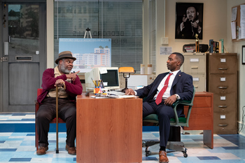 Director Reginald L. Douglas understands the power of Wilson's language in his production of Radio Golf at Round House Theatre in Bethesda, Maryland, and he has gathered five accomplished performers in a timely story about success, authenticity, and whether it's possible to accomplish both at once. Radio Golf is Wilson's final play in the cycle, both chronologically (premiered the year before he died) and in its setting (Pittsburgh, 1997), but its themes and characters have connections that go back to the beginning of the last century. The story concerns the building of a legacy, the decisions of what must remain and what has to be let go. (Interestingly, another play currently running in Washington–Good Bones at Studio Theatre–considers similar ideas from a more individual perspective.) Harmond Wilks (JaBen Early) is a second-generation real estate agent and developer in Pittsburgh, and he wants to be the next mayor. He's determined to bring prosperity to the historic but crumbling Hill District by building apartments and introducing national retail (Whole Foods, Starbucks, Barnes & Noble), all of which would gentrify the neighborhood and probably dispossess the long-term residents. His wife Mame (Renee Elizabeth Wilson) is a political consultant currently employed by the governor of Pennsylvania. His business partner Roosevelt Hicks (Ro Boddie) is a bank vice president who, through his love of golf (specifically Tiger Woods), believes that unchallenged excellence can defeat bigotry. The drama proceeds from the arrival of two longtime Hill residents: Sterling Johnson (Kevin Mambo), a scrappy self-employed construction worker; and Elder Joseph Barlow (Craig Wallace), whose family owned a house slated for demolition. "Old Joe" is easily the most entertaining character, and Wallace finds every nuance as Old Joe recounts pieces of his almost 80-year life, his regrets, his beliefs, and his family's central role in the life of the Hill. While his performance is frequently hilarious, Wallace never loses the determination of his character to prevent the erasure of history. Meghan Raham's scenic design enlivens a fairly bare-bones office scene with a sweeping backdrop of old buildings and construction sites. Moyenda Kulemeka's costumes range from Mame's classy suits in vivid colors, with matching high-heeled pumps, and Harmond and Roosevelt's sleek business attire to Sterling's work clothes and Old Joe's worn cardigan and beat-up hat. Radio Golf runs through July 2, 2023, at Round House Theatre, 4545 East-West Highway, Bethesda MD. For tickets and information, please call 240-644-1100 or visit www.roundhousetheatre.org. By August Wilson Cast: |