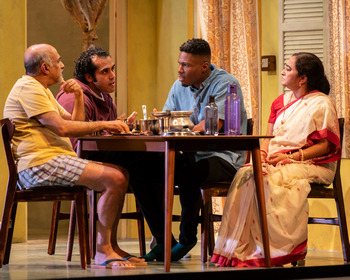 The bilingual play, which runs almost three hours, takes a slow, deep dive into the Bengali culture of Kolkata, India, as American-born Choton (Abrar Haque) visits his relatives accompanied by his Black American partner, Raheem (Jakeem Dante Powell). The speech flows easily between English and Bangla, with projected translations when necessary. Choton has come to research queer culture in Kolkata, particularly through the lens of "public obscenity" laws enacted during British rule, with Raheem filming his interviews with local activists. They are staying with Choton's aunt and uncle, Pishimoni (Gargi Mukherjee) and Pishe (Debashis Roy Chowdhury), along with family retainer Jitesh (Golam Sarwar Harun) in an elaborate house (designed by Peiyi Wong) filled with fascinating details and dominated by a stern portrait photograph of Pishimoni's late father, a college principal. The playwright digs down methodically, putting together the pieces like a jigsaw puzzle. Rather than major revelations, the discoveries tend to appear in passing as Choton tries to organize a picture from the fragments he can unearth. Elements of the past, such as the discovery of undeveloped film in the grandfather's old camera, overlap with Pishe's fascination with online gaming and his recounting of a cinematic dream to Choton, and how online influencers and hip-hop culture are melding with Bengali tradition. Each character adds to the mosaic: outspoken interviewees Shou (Tashnuva Anan) and especially Sebanti (NaFis) stand out in their vivid costumes (by Enver Chakartash), and Harun reveals an ethereal singing voice. The overall effect is mesmerizing as one piece of the past builds on another. While Haque and Powell are the anchors of the production, the entire cast works together elegantly as a seamless unit. Public Obscenities runs through December 23, 2023, at Woolly Mammoth Theatre Company, 641 D St. NW, Washington DC. For tickets and information, please call 202-393-3939 or visit www.woollymammoth.net. Written and directed by Shayok Misha Chowdhury Cast: |
