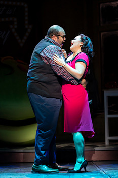 Director Kevin S. McAllister has looked beyond previous productions of the musical by Howard Ashman (book and lyrics) and Alan Menken (music) in his casting, finding accomplished performers with fine voices while emphasizing diversity and stepping away from what audiences might expect. As played by Derrick D. Truby, Seymour, the floral shop employee who discovers and nurtures Audrey Two before he realizes what he's gotten himself into, is still a lovable nebbish. The fact that he's a tall, large man, a bit ungainly, adds to the humor: he towers over his boss Mr. Mushnik (Lawrence Redmond, hilariously dyspeptic) and doesn't realize what he's capable of until it's too late. Audrey (Chani Wereley), Seymour's co-worker and crush, is not a bottle blonde and she demonstrates inner strength; life may have been tough, but she still believes in something better. And Joe Mallon, as Audrey's bullying beau Orin, at first comes across as all bluster and doesn't reveal the character's darker side until later. He also shines in several small roles that require quick changes of both costume and accent. Similarly, the technical elements stand out without calling undue attention to themselves. Hathaway's scenic design uses vivid colors to make Skid Row appear just slightly more intense than realistic. Alejo Vietti's costumes delineate character–each of the three singing street urchins (Kaiyla Gross, Nia Savoy-Doc, and Kanysha Williams) has her own individual look–and Max Doolittle's lighting design provides both rapturous skies and moments of horror. Choreographer Ashleigh King keeps things moving with style and imagination (especially when Audrey Two is involved), with powerful support from five musicians led by William Yanesh. Little Shop of Horrors runs through May 18, 2024, at Ford's Theatre, 511 Tenth St. NW, Washington DC. For tickets and information, please call 202-347-4833 or visit fords.org. Book and lyrics by Howard Ashman Cast: |