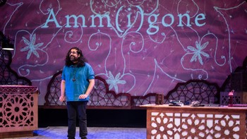Yes, that sounds esoteric, but the result is captivating and enlightening. Over the space of 80 minutes, the audience learns much about cultural interaction, different perceptions of Islam, how each translation of a classical text may add a specific viewpoint to the original author's intent, and whether Mansoor's religiously observant mother will accept his loving relationship with a man. Mansoor is a warm, welcoming presence as he tells his own story and shares the experiences of people he has known. Aided by co-director Lyam B. Gabel, he has crafted this performance as a way to bridge the gaps of understanding he feels between his mother and himself. For an example of the levels involved here, the title of the work suggests the name Antigone while also incorporating "Ammi," the Urdu word for "mom." Mansoor explains his fascination with the ancient Greek story of Antigone and why he thinks studying it could bring his mother and himself together. As he explains, Antigone's two brothers died in battle over which one would rule their kingdom; their uncle, who took the throne, decreed that one brother be honored in death while the other would be left unburied, denying him access to an afterlife. Antigone devoted herself to burying her brother's body with the knowledge that doing so would lead to her own execution, thereby leaving her sister alone and friendless. The multi-layered performance goes beyond Mansoor's appearance onstage to incorporate actual emails and recorded voicemail messages from his mother, including his translations from Urdu. He shares stories of growing up in a family unlike those of his classmates, the joy of traditional holiday observances, and the search for a space where he and she can finally communicate truths that they both have been unable to share. Set designer Xotchil Musser has created a simple but evocative playing space, framed with wood paneling and furniture in an elaborate geometric Islamic design. Media co-designers Joseph Amodei and Davine Byon bring small details into high relief, specifically with close-up projections of embroidered and embellished pieces of brightly colored fabric. (Mansoor's mother did not begin wearing the traditional hijab until later in life, so he uses these fabrics to cover her unveiled image in family photos.) Woolly Mammoth has announced that this production will begin a national tour following the run, beginning at Long Wharf Theatre in New Haven, Connecticut. Amm(i)gone runs through May 12, 2024, at Woolly Mammoth Theatre Company, 641 D St. NW, Washington DC. For tickets and information, please call 202-393-3939 or visit www.woollymammoth.net. Created and performed by Adil Mansoor |