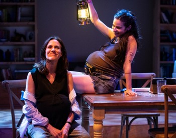 Jonas created this play as a response to Sam Shepard's True West, which examines the twisted bonds between two estranged brothers, a screenwriter and a petty crook, to see how the situation might play out with women rather than men. To begin with, both Jess, who has specific goals in her life, and the basically feral Rory are eight months pregnant as the action begins. Jess is using art to process her dysfunctional childhood and youth, creating drawings based on family photos originally sent to her in text messages. Rory, nine years younger than her sister, also sees herself as an artist, both because she is interested (not trained) in drama and dance and in the way she manages to convince strangers to give her money for non-existent good causes. On the one hand, Rory seems to care little about her own personal hygiene: she arrives with dirt-caked bare feet and appears to have no interest in bathing. On the other, she is determined to eat only "natural" foods and worries that drinking coffee will damage the health of her child. As in Shepard's play, an arbiter of taste (Maya Jackson as Anita, an elegant gallery owner) finds herself bamboozled by Rory's unrealistic self-confidence while Jess tries to set the record straight. In her long, brightly printed jacket over pristine white shorts and top (one of Helen Q. Huang's more naturalistic costume designs), Anita seems to inhabit a world utterly apart from either Jess or Rory. In addition, the legendary Washington actress Nancy Robinette appears late in the play and walks off with it. She plays the sisters' aunt, in whose Vermont home they are staying during her (now abbreviated) trip to Paris. Her facial expressions, physical postures, shifting facial expressions as she tries to understand her nieces' behavior, and dead-on line readings come together to create a gem of a performance. Emmie Finckel's scenic design squeezes a remarkable amount of detail into the unit set, from the books on the built-in bookshelves to the rough-hewn dining table and chairs and the side window displaying the lush Vermont greenery outside. Lighting designer Colin K. Bills integrates actual lighting fixtures (notably a chandelier made from antlers) with more expressionistic touches. Problems Between Sisters runs through June 16, 2024, in at Studio Theatre, Mead Theatre, 1501 14th St. NW, Washington DC. For tickets and information, please call 202-332-3300 or visit www.studiotheatre.org. By Julia May Jonas |