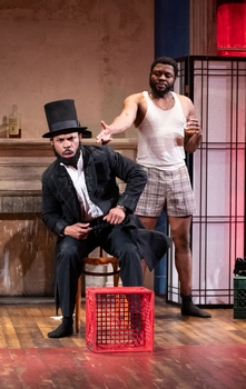 The action takes place in the single room where Booth (Dogbe), an aspiring three-card monte dealer, lives and his older brother Lincoln (Boddie) is staying after the breakup of his marriage. Meghan Raham has created an immense amount of detail in this box-like room in a repurposed industrial building, from the large red neon letters outside the windows to the cloud-like colors painted on the soaring ceiling. Clearly, the building as well, as the residents, has seen better days. The brothers have looked out for themselves and each other since their teens, when their parents left them on their own with some money and no other support. Their names are jokes given them by their father, but Lincoln has taken his to heart: he works in an arcade in whiteface as an Abraham Lincoln impersonator, where customers can pay to "shoot him in the head" with toy guns. (He was in the three-card monte grift but got out when it became too dangerous.) Booth, on the other hand, survives by shoplifting and reselling merchandise while trying to perfect his technique as a con artist out to scam the tourists. (Ryan Phillips is credited as "card manipulation consultant.") Parks' genius is in the way she uses language to build her characters. As Booth, Dogbe is charmingly excitable and optimistic, rattling on about the woman he loves and his plans for the future even as he lives his present life in limbo. Boddie embodies the gravitas of Lincoln, who knows that things don't necessarily work out and is getting worn down. The design team draws the audience into this constricted space with Booth's single mattress on a bare metal frame, the recliner chair where Lincoln sleeps, and other makeshift pieces of furniture. Xavier Pierce's atmospheric lighting design incorporates candlelight, while Danielle Preston's costumes include aspirational suits in anticipation of Lincoln and Booth's better days (which Booth smuggled out of a store). Topdog/Underdog runs through June 23, 2024, at Round House Theatre, 4545 East-West Highway, Bethesda MD. For tickets and information, please call 240-644-1100 or visit www.roundhousetheatre.org. By Suzan-Lori Parks |