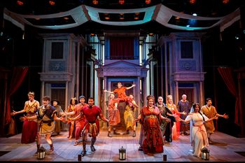 Director and choreographer Matthew Gardiner continues Signature's decades-long devotion to the works of composer-lyricist Stephen Sondheim with this effervescent production, which plays with gender in ways that the original (book by Burt Shevelove and Larry Gelbart) did not when it premiered in 1962. Most obviously, the House of Lycus (Lawrence Redmond) now offers courtesans representing a variety of genders, and (as with Whoopi Goldberg in the most recent Broadway revival) the star role of Pseudolus is played by a woman. Erin Weaver may look diminutive in size but she's a powerhouse performer with boundless stamina and dead-on comic timing, and she cheerfully keeps things bubbling as the plot complications pile up. Forum is the first musical for which Sondheim contributed music as well as lyrics, and it includes examples of his delicious wordplay ("I pine, I blush, I squeak, I squawk/Today I woke too weak to walk") and self-parody ("Lovely is the one thing I can do"). The songs may be more than six decades old, but they have not noticeably aged. Shevelove and Gelbart created the book from the works of the Roman playwright Titus Maccius Plautus (c. 254 BCE 184 BCE), which have inspired farceurs since then. The characters are broadly drawn but still recognizably human: the naïve boy blindsided by love, Hero (Zachary Keller); his still-randy father Senex (Christopher Bloch) and stentorian mother Domina (Tracy Lynn Olivera); the fastidious slave supervising their household Hysterium (Mike Millan, whose descent from dignity is hilarious); the innocent young woman who may or may not know more than she lets on, Philia (wide-eyed Kuhoo Verma); and the bombastic soldier determined to marry her, Miles Gloriosus (Cameron Loyal). Signature stalwart Sherri L. Edelen appears (unrecognizably) in two outrageous roles. Gardiner's direction maintains the underlying idea that, in the service of comedy, too much can never be enough. Lovers waggle their tongues at each other and basically act like puppies, Hysterium reveals every emotion (or more than one at a time) on his face, and several characters try hard to maintain their decorum but just can't carry it off. The physical production adds to the overall sense of joy. Jimmy Stubbs' detailed scenic design offers three multi-level house facades and a few surprises, while Erik Teague's costume designs range from serviceable to fabulous (meant in the best way). Music director Jon Kalbfleisch oversees 14 polished and hard-working musicians from above the stage. A Funny Thing Happened on the Way to the Forum runs through January 12, 2025, at Signature Theatre, MAX Theater, 4200 Campbell Avenue, Arlington VA. For tickets and information, please call 703-820-9771 or 1-800-955-5566 or visit www.signature-theatre.org. Book by Burt Shevelove and Larry Gelbart Cast: |