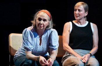 Director Vivienne Benesch demonstrates an easy confidence in the way she presents the bonds that develop between Diana (Norris), an artist, and Alice (Twyford), the hippie-ish wife of an economics professor. (The setting is college town Columbus, Ohio, during the summer of the American Bicentennial.) Originally, they meet because of a friendship between their young daughters and a need for a babysitter, but as the days and years pass the two women realize both how alike they are and how sometimes they complement each other. The two actresses comprise the entire cast, and they both find subtle ways to convey the women's unacknowledged prejudices, unwarranted assumptions, and growing emotional connection. Unseen characters, such as the two children and the college student painting Alice's house, also come to life through Auburn's writing; Norris, in addition to her own role, succeeds in the challenge of standing in for Alice's husband in some scenes. (She differentiates his character from Diana's by giving him a more plodding walk and a deeper voice with an undercurrent of exasperation.) To emphasize the elemental nature of the story, the action plays out on Lee Savage's set with only a bare wooden floor and two chairs. However, the ever-shifting patterns shown on the rear wall (lighting design by Jesse Belsky, projection designs by Stefania Bulbarella) suggest both the artworks Diana creates and the complex, textured, sometimes uneven nature of the women's friendship. Costume designer Helen Q. Huang subtly emphasizes their different perspectives through their clothes: Diana wears a sleek sleeveless top and a split skirt in neutral colors, while Alice wears a smocked burgundy blouse over her ankle-high jeans. Summer, 1976 runs through January 5, 2025, at Studio Theatre, Milton Theatre, 1501 14th St. NW, Washington DC. For tickets and information, please call 202-332-3300 or visit www.studiotheatre.org. By David Auburn Cast: |