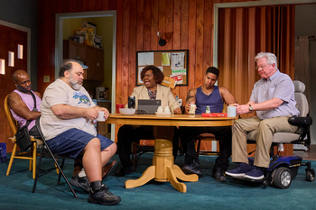 Norris sets up the stakes from the beginning. In his early teens, Andy (Tim Getman) was molested by his piano teacher, Fred (Dan Daily). Decades later, Fred has completed his prison sentence and lives in a halfway house with three other men on the sex offender list; Andy and his wife Em (Emily Kester) have come to visit to settle accounts and try to move beyond the lingering trauma. Norris' concern is whether people who have committed horrific crimes can ever receive forgiveness and be accepted back into society. Fred, the oldest of the residents and on the surface an aw-shucks white Midwesterner, shares the house with Dee (Stephen Conrad Moore), whose crime derailed a promising career as a director and choreographer; Gio (Jaysen Wright), who shrugs off his conviction as the stupidity of youth and wants to build a new life as an entrepreneur; and Felix (Richard Ruiz Henry), a melancholy man who says little and keeps his distance from the others. Director David Muse understands that the level of tension among the men and those around them needs to stay at a simmer before the explosion the audience knows is coming. Beginning with petty squabbles and faded dreams, Norris takes his time building one thing onto another until the inevitable happens–and when it occurs, it's a gut punch to the audience as well as the characters. It's difficult to point to any one of the major performances as the standout; they all have their gripping moments of normality, of bluster, and of understandable anger. Kelli Blackwell more than holds her own as their no-nonsense parole officer. Alexander Woodward's scenic design adds its own sense of futility to the characters' lives. The house is cramped, with only one bathroom, and because space is tight, Felix's bedroom is part of the living room, separated by a flimsy folding door. Downstate runs through February 16, 2025, at Studio Theatre, Victor Shargai Theatre, 1501 14th St. NW, Washington DC. For tickets and information, please call 202-332-3300 or visit www.studiotheatre.org. By Bruce Norris Cast: |