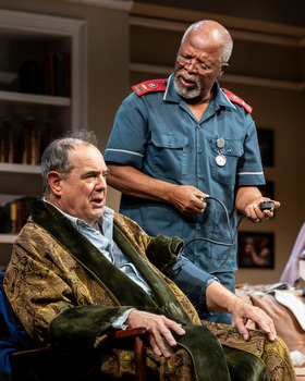 The play, directed with great empathy by Ruben Santiago-Hudson, follows the connection that develops between Jack Morris (Edward Gero), an aging Shakespearean actor determined to play King Lear before he dies of liver cancer, and his new caregiver, Lunga Kunene (Kani). The setting is South Africa in 2019, 25 years after the end of apartheid. The relationship begins with tension: Jack's former caregiver was a white woman, and he doesn't feel comfortable with a Black man (who still lives in Soweto) living in his house and taking care of his needs. Jack is cantankerous, sneaking sips from the small liquor bottles he has hidden throughout his living room, but his focus on Lear keeps him from crumbling into self-pity. Kunene is fascinated by Shakespeare's words, especially because in school he studied Julius Caesar translated into the indigenous Xhosa language. The play, which runs about 90 minutes without an intermission, follows how the two men bond in unexpected ways. The first two scenes take place in Jack's home (scenic designs by Lawrence E. Moten III), roomy and filled with theatrical memorabilia and other decorative items; the third shifts the focus to Kunene's residence, much smaller and less elaborate but just as reflective of his life as Jack's is of his. Kani acknowledges the vast chasm between the life experiences of Jack and Kunene, and the former's resentment that people he considers inferior to him are now in positions of power. Still, the drama never turns into a polemic, and much of the dialogue is clever and often humorous. The third element of the production adds an otherworldly touch to the drama that focuses on the underlying African culture. Ntebo, a South African singer now based in Washington, performs ravishing a cappella melodies between the scenes, dressed in elaborate and majestic robes and headdresses (costume designs by Karen Perry, a vivid contrast to Jack's regal yet threadbare dressing gown and Kunene's nurse uniform). Kunene and the King runs through March 23, 2025, at Shakespeare Theatre Company, Klein Theatre, 450 Seventh St. NW, Washington DC. For tickets and information, please call 202-547-1122 or 877-487-8849 or visit www.shakespearetheatre.org. By John Kani Cast: |