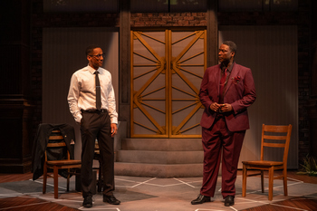 If that sounds pretentious and off-putting, it isn't. Director Nicole Brewer and 10 talented actors follow the path of Black leader Julius X (Brandon Carter) after he returns to Harlem from a pilgrimage to Mecca. The Shakespearean cadences are apparent in the gravity of the writing, even when Letson isn't directly borrowing his words. Jonathan Dahm Robertson's scenic design, depicting the façade of a Harlem brownstone, ingeniously does a lot with a little: the two-story unit set covers the doorways with vertical blinds, allowing for striking shadow effects as part of Porsche McGovern's lighting design, and fire escapes let the actors make naturalistic entrances and exits. The physical production helps to lay out the characters and their perspectives. Julius, in his embroidered floor-length robe or his simple suit and tie (character-defining costumes designed by Danielle Preston), has come home from his pilgrimage with a new vision–that race alone does not determine the virtue of an individual–so he wants his followers to expand their own beliefs about the people around them. Cassius (Jay Frisby), smart and sleek with wavy hair and physical grace, worries that Julius' changes would ruin the community's future and suggests that loyal supporter Brutus (Greg Alverez Reid), a large man in an elegant burgundy suit, join his violent plot to seize power. On the other side is Marc Anthony (Jonathan Del Palmer), determined to stand with his leader. The performances pop in their rhythms of hip-hop and street slang, mixed with sprinklings of iambic pentameter. Nikkole Salter brings the viewer into the heart of Julius' wife Calpurnia, his partner in life and mission and the mother of his children, and the joys and heartaches she has experienced, and the rest of the ensemble operates at the same high level. Folger Theatre intends this production to launch an ongoing dialogue with its audiences. Specifically, audience members are invited to contribute notes and small keepsakes to an informal community altar recognizing the importance of people who influenced their lives. Julius X: A Re-Envisioning of the Tragedy of Julius Caesar by William Shakespeare runs through October 26, 2025, at the Folger Shakespeare Library, Elizabethan Theatre, 201 E. Capitol St. SE, Washington DC. For tickets and information, please call 202-544-7077 or visit www.folger.edu/whats-on/events/theater/ By Al Letson Cast, in alphabetical order: |