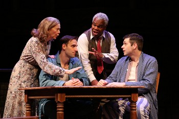 As familiar as Arthur Miller's play, winner of the Pulitzer Prize and Tony Award, has become since its 1949 premiere, it retains a primal force in its examination of fathers and sons and the flaws of the American dream. The fact that Wallace is African American, while his sons are played by white actors, is beside the point in this production; on the other hand, Schraf, who plays Willy's wife Linda, and Wallace are also partners in life and the warmth and connection of that bond comes through in the portrait of a man coming to the end of his patience and a woman trying her best to help save him. The play covers the last day in the life of Willy Loman, a salesman who has devoted himself to the pursuit of success for himself and his family. He dreamed of wealth and respect for his sons Biff (Keegan) and Happy (Gavigan), but Biff doesn't know what to do with his life and Happy cuts corners wherever he can. Linda knows Willy's weaknesses (some of them at least) and loves him anyway. With his powerful presence and voice, Wallace clearly shows how Willy has spent his life fooling himself and those around him. Listen to the ways he contradicts himself, or how he tells rosy stories of his successes in business but then has to reckon with the reality of the situation and make excuses for his shortcomings. Keegan, whose frustration builds to a boil, and slick, hotheaded Gavigan strike sparks with each other and with Wallace, and Schraf shines in both joy and sorrow. The other standout is Frederick Strother as Willy's brother Ben, a fearless and ruthless man who embodies Willy's conception of success. The most striking element of Tim Mackabee's scenic design is the inclusion of numerous windows looming over the Loman house, hemming it in and smothering the life out of the family. Wade Laboissonniere's costume design ranges from natty suits and elaborately detailed day dresses to Ben's intimidating white suit and Linda's house dresses.