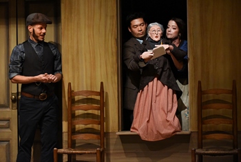 Don't worry, Posner's production in the Mulitz-Gudelsky Theatre Lab at Olney Theatre Center in suburban Maryland is not a send-up of Wilder's classic in the mode of Avenue Q. The theatricality of seven actors who play their own roles, then take on the other characterizations while manipulating lifelike if child-size figures designed by Aaron Cromie, is hypnotic as it draws the viewer in, creating an alternative reality. Posner has staged the action "alley style," with the performance area running lengthwise between facing banks of seats. Misha Kachman's bare-plank scenic design sets the home of the Webb family (Todd Scofield, Andrea Harris-Smith, Cindy De La Cruz) at one end and the Gibbs family (Tony Nam, Megan Anderson, William Vaughan) at the other. In between, the Stage Manager (Jon Hudson Odom) slips in and out of character while cast members provide live sound effects: the clink of glass milk bottles, the whistle of a distant train. Another one-time theatrical innovation that has become commonplace is multicultural casting, which demonstrates how Wilder's self-contained town of early 20th-century white, Christian New Englanders can be a microcosm for an entire diverse world. The puppets are diverse as well, from the outspoken African-American church lady to the reframing of a pedantic professor as a woman. Odom is a low-key marvel as he shape-shifts from one characterization to another, and the other actors find the unique humanity in the people they embody. De La Cruz and Vaughan convey the heartbreaking youth of Emily and George without overplaying, while Nam, Anderson, Scofield, and Harris-Smith bring a comforting lived-in presence to their roles. Olney Theatre Center |