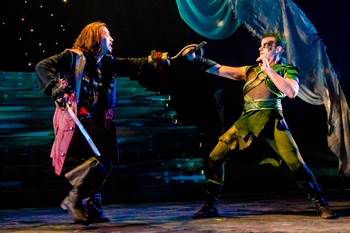 Director Paata Tsikurishvili, choreographer Irina Tsikurishvili, and adaptor Ed Monk started with Sir James Barrie's original play and novel but, as with the company's other adaptations, put their own stamp on the material. They begin the performance with an origin story for Tinkerbell (Ana Tsikurishvili) and how she becomes Peter's companion, then show Tinkerbell's bringing Peter's shadow (Zana Gankhuyag) to life. (Examinations of split identities are a Synetic trademark, from giving the portrait an independent persona in The Picture of Dorian Gray to dividing Iago's character among three performers in Othello.) While this Synetic production incorporates dialogue, the physical activity never lets up: even before Peter Pan arrives in their bedroom, brothers John (Thomas Beheler) and Michael Darling (Scott Whalen) attempt to "fly" by jumping on their beds. Kathy Gordon is a lovely Wendy, able to stand up for herself but as interested in fun as the Lost Kids (unlike Barrie's story, they aren't all boys)who, in an intriguingly surrealistic touch, run around Neverland pushing one-wheeled bicycles with animal heads mounted on the handlebars. Then there are the pirates, a rollicking bunch led by Sellers' deliciously self-dramatizing Hook and his sidekick Smee (Nathan Weinberger), almost overbalanced by his enormous belly. And there are mermaids too! Daniel Pinha's massive scenic design shifts from one locale to another by rotating and splitting in half; the airy, segmented curtains rise to become billowing sails, and a shimmering blue sheet represents the sea. Kendra Rai costumes the pirates in a coordinated palette of red, black, and white, while Tinker Bell's costume glows with color-changing fiber optic lights. Synetic Theater |