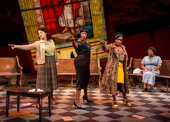 Director Timothy Douglas and choreographer Lady Dane Figueroa Edidi are working with four notable singers and dancers, given constant support by music director and offstage pianist Darius Smith. The songs and dances convey all the soul and emotion an audience could hope for, but the dialogue scenes get bogged down in words. Playwright Christina Ham tells the story of Simone (Harriett D. Foy) through the lens of the 1963 bombing at the 16th Street Baptist Church in Birmingham, Alabama, which killed four African-American girls. Simone, still in her sequined black dress from a singing engagement, finds herself in the rubble of the church (in Timothy Mackabee's hallucinatory set, some of the pews hang suspended above heaps of brick dust) with three other women: Sarah (Theresa Cunningham), a domestic and member of the church; Sephronia (Toni L. Martin), a civil rights activist whose comparatively light skin often earns her scorn; and Sweet Thing (Felicia Curry), a tough prostitute. The three archetypes become elements of Simone's song "Four Women," with Simone taking on the role of the fourth woman. The first part of the 100-minute performance (no intermission) is largely Simone telling her story to Sarah, with moments of song: her childhood as a musical prodigy, performing in the church where her mother preached; her experiences as an African-American aspiring classical pianist facing a white establishment; her early career singing American standards in nightclubs; and, ultimately, the anger that turned her into a protest singer. She is inspired by racial violence to write incendiary songs like "Mississippi Goddam" and "Old Jim Crow" as a way to "say the unspeakable" and "create music that wakes us up." The second half is a political debate among the women, touching on the conflict between Martin Luther King Jr.'s insistence on peaceful activism and Malcolm X's more violent struggle, which Simone favored. The other main issue, as Simone sees it, is that the men who ran the Civil Rights Movement used the work of women like Sephronia but kept them in the background. (One note: the play uses the term "women's lib," which didn't enter the language until later in the 1960s and '70s.) The idea that the personal is political comes through in a battle between idealistic Sephronia and pragmatic Sweet Thing, as Sarah finds her relief in hard work and prayer. Through everything, Simone is right: the true catharsis comes through the music. Arena Stage |