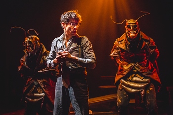 Director Paata Tsikurishvili adds to the surrealistic nature of Kafka's story by picking up a device the author used in his story "Metamorphosis," which Synetic also has adapted. As Josef finds himself accused of a nameless crime and struggling to find answers, his tormentors are hideous, human-size insects (costumed with ingenuity by Erik Teague). Josef retains his human shape, including his bookish glasses, while he is surrounded by creatureseven his landlady (Kathy Gordon) and his neighbor (Tori Bertocci)with antennae, sharp appendages attached to their hands and arms and, in some cases, glowing eyes. Nathan Weinberger's text adaptation uses dialogue, unlike many of Synetic's productions, but the words are used in a way that adds to Josef's growing awareness that nothing means anything. He can't fight the charges against him if no one can or will tell him what they are; he's tortured for asking questions; he seeks help and finds only corruption, predation, or advice to just give up. The most striking examples of this are Huld (Ryan Tumulty), a grotesque lawyer who rides around the stage in an electric cart, and his carnivorous attendant, Leni (Gordon). Irina Tsikurishvili's movement design emphasizes the paradox of reality and unreality on Daniel Pinha's set. Figures crawl through windows and hover upside down, they emerge from holes in the floor and slither up and down stairs, as Brian S. Allard's lighting design shoots out beams in hot colors and washes the stage with a curtain of light. Composer Konstantine Lortkipanidze and sound designer Thomas Sowers add to the unease with an aural undercurrent based on a threatening industrial roar. Synetic Theater |