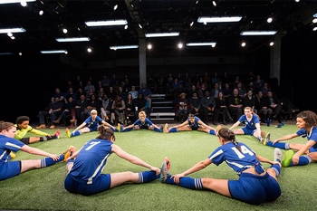Playwright Sarah DeLappe has created nine distinct characters with individual experiences and diverse possible futures who meld together as a unit when it's time to compete. Director Marti Lyons has guided her actors into a natural rhythm of physical and verbal interactions, avoiding any sense of "playing young" or inauthenticity. Eight of the nine Wolves have worked together for years, and while they aren't all exactly friends away from the soccer field, they're highly communicative as they do their pre-game warmups. They have their individual quirks, such as: #7 (Katie Kleiger) is outwardly tough and confident in her abilities; #2 (Merissa Czyz) comes from a religious family and worries about the underprivileged; #25 (Chrissy Rose), the team captain, takes charge of practices because the (never-seen) coach has other things to do; and #00 (Gabby Beans), the goalie, doesn't say much and has stomach problems. Their conversation ranges widely from real-world concerns (the war crimes trial of a Khmer Rouge commander, the pending deportation of undocumented children to Mexico) to their families, other interests (such as Harry Potter and "Lord of the Rings"), and the realities of sex. When #46 (Jane Bernhard) joins the team, the others aren't sure what to make of her. The cast members worked with movement coach Stephanie Paul and soccer consultant Manya J Makoski to polish their athletic skills. While the audience never sees the Wolves in a game, the actors are dead-on as they do exercises, stretches, sprints, and practice passing the ball. The standouts are Kleiger, Bernhard, and Maryn Shaw as Kleiger's off-field friend.