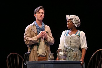 Playwright Timberlake Wertenbaker has structured the play to be performed in presentational style by nine actors of various ages and races. They periodically address the audience and shift from one character to another with the help of minimal costumes (designed by Ivania Stack) and abstract pieces of scenery (by Milagros Ponce de Leon). Director Nataki Garrett does her best to bring continuity out of the script's contradictions. The story begins with a group of English Quakers and one German, Carl Christian (Michael Halling), as they sail to the New World in the mid-1700s. They settle in Maryland, where Carl Christian's son Christian (Christopher Dinolfo) learns shoemaking from his father. He wants to join the revolutionary effort, angering his pacifist family, but promises that he will never carry a gun or otherwise spill another person's blood. This is the kind of story where, no sooner does Christian arrive in Williamsburg, Virginia, he encounters his hero Thomas Jefferson (Halling). More importantly, he becomes friendly with Susannah (Felicia Curry), an enslaved woman who works at the tavern where he is staying. (The script includes such lines as "If liberty is a fever, I want to catch it" and "Please don't interrupt Patrick Henry.") Wertenbaker's tone is uneven: she tries to depict the horror of war even as the actors announce after intermission that they were making their way through the Revolution while the audience members enjoyed their drinks. After the war ends, Christian makes his way to Monticello, where he becomes a surrogate son to Jefferson and gets to know Sally Hemings (Kathryn Tkel), the enslaved half-sister of Jefferson's late wife, and her brother James (Michael Kevin Darnall). In another odd juxtaposition, while various historic figures explain how the U.S. Constitution came to value slaves as three-fifths of a citizen for census purposes, James Madison (Thomas Keegan) is portrayedapparently for comic reliefas a nervous boy overshadowed by his domineering mother (Kimberly Gilbert).