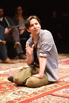 Actor Alexander Strain, guided with subtlety and skill by director Jason Loewith, provides the backbone and substance of the play, but the audience members in the intimate space make each performance a unique experience. Strain chats with the audience before the 65-minute performance, asking some of them to play improvisational roles (in one case, involving a sock puppet) and others to verbalize excerpts from the list of "brilliant things" Strain's character collects beginning at the age of 7. The premise is that Strain's character grew up with a mother coping with suicidal depression. As a child, after his mother recovered from her first suicide attempt, he decided that he would cheer her up with a handwritten list of one million brilliant things in life. He put the list aside at several points but always took it up again, and he takes the audience on the journey with him. The sound design by Jane Behre and Ryan Gravett adds measurably to the atmosphere, as the narrator describes the different kinds of music he grew up hearing (mostly jazz artists) and his love for the long-playing record and its liner notes. Paige Hathaway has provided a cocoon-like setting for the drama, using elaborate carpets to delineate the limits of the stage. In conjunction with this production, Olney is working with the National Association on Mental Illness-Montgomery County and the American Foundation for Suicide Prevention to promote awareness of suicide and to help survivors (like Strain's character) to understand that they bear no guilt for the actions of those around them.