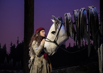 Director Molly Smith, also the 20-year Artistic Director of Arena Stage, lived in Alaska for many years and co-founded Perseverance Theatre in Juneau, which co-commissioned Snow Child and will host this production following the Arena run. John Strand's book, adapted from a novel by Eowyn Ivey, takes its inspiration from a Russian folktale about a childless couple who make the figure of a girl out of snow; the girl comes to life but never loses the impermanence of snow when the weather turns warm. In this retelling, set in the early 1920s, Mabel (Noll, wounded yet hopeful) and Jack (Bogart, determined) left their home in Pennsylvania after their child was stillborn, deciding to make a new life as homesteaders in Alaska. The work is hard and lonely, Jack worries that their farm won't sustain them through the winter, Mabel is isolated and just wants the pain to end ... and then Faina (Strazza) appears, a wide-eyed, seemingly feral child, trailed by a white fox. (The animal puppets are another highlight of the production. Dorothy James controls the fox stick puppet with great subtlety; David Landstrom and Calvin McCullough together manipulate a sturdy plow horse and Landstrom also embodies a large, elegant swan.) Noll and Bogart bring rich voices and great dignity to their roles, and Strazza is a luminous presence whenever she appears. They get strong support from Dan Manning, Natalie Toro, and Alex Alferov as their nearest neighbors in the vast outdoors. The score, with music by Bob Banghart and Georgia Stitt and lyrics by Stitt, uses bluegrass and folk-inspired melodies to ground the story in its specific time and place. Conductor William Yanesh leads five other musicians (including fiddle, mandolin, and banjo) from the keyboard. "Grateful" is a catchy hymn and other songs add to the depths of the characters. Not everything works, however. Snow Child is part of Arena's series of Power Plays, play commissions focusing on defining moments in U.S. history (previous topics include the Camp David accords, the life of Supreme Court Justice Antonin Scalia, and a legal case regarding tribal sovereignty on a Cherokee reservation). George (Manning), Esther (Toro), and their son Garrett (Alferov) occasionally toss off comments about how the elites in New York and Washington treat Alaska as their possession rather than letting the people who live there do what they have to do, but when survival is the main issue, politics fall to the side.