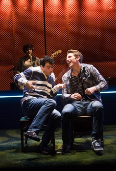 Director Matthew Gardiner has two personable performers, Jimmy Mavrikes and Lukas James Miller, and keeps them busy on Micha Kachman's serviceable set with Colin K. Bills' expressionistic lighting design: they chase each other around the stage, play air guitar, perform choreography designed to look as if they're improvising, call each other on their brick-like cordless phones, and listen to mix tapes on their boom boxes (the year is 1993, the place a town in Nebraska). Behind the performance area is a glass-enclosed sound booth where a four-woman rock band led by keyboardist/conductor Britt Bonney play and sing the songs. It's the summer following high school graduation for Will (Mavrikes), a sensitive young man who knows he's gay but doesn't talk about it (except that privately he sees his life in terms of musicals), and Mike (Miller), the athletic and academic star who never paid attention to Will when they were in class together but is now interested in a friendship. They go to a drive-in theater over and over to watch an absurd movie about a nun who's also a superhero, and Mike talks about his girlfriendwho lives in a neighboring town, so Will doesn't know herand plays his (real) guitar. Will is coping with his parents' divorce and has no plans for his life after high school. Mike's father is a perfectionist, a doctor who expects his son to go to medical school whether he wants to or not. The relationship between them grows incrementally, which is true to life but allows for restless audience members to check the program and see what the next song will be and how soon it might be coming up.