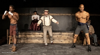 Playwright Marco Ramirez captures this powerful moment in America's social history in The Royale, inspired by the story of Jack Johnson, the first African-American world heavyweight champion, embodied here in the character of Jay "The Sport" Jackson. Tightly written and fiercely physical, The Royale is a fiery tinderbox of words and motion. Staged by innovative director Kate St-Pierre, the LAB LV's production packs an emotional wallop. The boxing scenes are staged head-on to the audience. Body percussion, composed by Jason Nious and executed by the performers, conveys the rhythm and intensity of the fight, and signifies the black community's connection to the unfolding events. There is no physical contact between the fighters. Instead, the percussion, lighting, and fighters' physical reactions tell us when and where the punches land. Timothy Burris's spare set design, with just a hint of a boxing ring, leaves the image-making to the performers. The effect is visceral. The on-stage electricity is not confined to the intensely physical scenes. The dialog is spare and powerful. Every moment in this fast-paced production is fueled by a potent mix of suspense and unease. As Jay, Mario Peoples commands the stage with his powerful but understated presence, injecting disarming warmth and charm as he deftly bobs and weaves his way through a press conference where the questions become increasingly racist. As the play nears its climax, Jay's face and body, so assured at the start, reflect his mounting disquiet as he begins to wonder who, if anyone, is actually on his side. In one scene, he methodically tapes his hands in complete silence except for the sound of the tape, yet the intensity of these small movements betrays his internal turmoil, which he then unleashes in a ferocious burst of shadow boxing. Nate Marbel is fascinating and compelling as Max, the "world's only interracial fight promoter," who uses his white privilege to navigate the racist corridors of the boxing world to see how far Jay can go. As Wynton, Jay's grey-haired trainer and himself a former fighter, Mervin Alexander creates one of the play's most harrowing moments as he describes (based on historical truth) what once passed as African-American "boxing" at the hands of the white establishment. Jamey Clay-Brown is sympathetic and convincing as Fish, a young African-American boxer just looking for his ticket out of the Navy Yards. Sabrina Cofield makes a powerful impression as Nina, Jay's sister, whose life has a complex connection with his ambitions. With its outstanding cast, powerful script, and sharp direction, The Royale islike the "fight of the century"an event not to be missed. The Royale runs through November 24, 2019, at The Playhouse, 528 S. Decatur Blvd., Las Vegas NV. Performances are Wednesday-Saturday at 7:30 p.m., Saturday at 2:30 p.m., Sunday at 5 p.m. For tickets ($20 in advance; $25 at the door; $15 military/students/seniors) and information, visit thelablv.org. Cast: Additional Creative: |