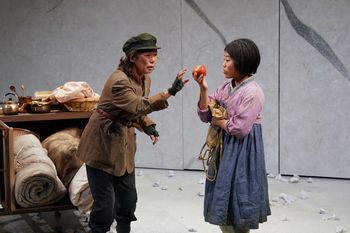 Suh was inspired to write this play by his own family history. In 1950, when his father was five or six years old, war broke out on the Korean peninsula, and his family fled the apple orchard which provided their livelihood for what they hoped would be safety in the port city of Pusan. Suh's father was given the job of carrying a backpack filled with apples. In Bina's Six Apples we find ten-year-old Bina in her treehouse, perched in an apple tree. Her father abruptly approaches to tell her that the family must leave at once, as the war is coming closer to their orchard. They will head on foot to Pusan, carrying everything they will need in their new life, especially food, pots and pans. Their journey of 70 miles will entail crossing wide rivers and navigating mountains. Bina is old enough to ask questions such as "what is the war about?" and "which side is the good side?"questions for which her father has no suitable answers. Like the playwright's father, Bina is given the job of carrying apples. Her backpack only holds six, but she decides that is a good number: it means that when they get to Pusan there will be an apple for each family member: for her father, her mother, her older sister and brother, her grandmother, and herself. Shortly after setting out, the family is beset by an air attackstaged with brilliant light, sound and visual effectsand all goes dark. When the lights return, Bina is separated from all the others and frightened. She has the presence of mind to know she must reach Pusan and meet her family there. But which way is Pusan? How will she get there on her own? Nonetheless, she sets out. Along the way she encounters a woman desperately trying to reach her son, a good-hearted soldier separated from his troop, a ferryperson whose boat, for a price, can get Bina across an imposing river, a merchant who has goods for sale that can aid Bina in her quest, and a boy younger than herself, lost within his dreams in a village that has been savagely attacked. Each of these encounters give Bina something of value to help her get closer to Pusan, but also to learn about herself. The play's clearly written dialogue creates a clear understanding of each encounter and the terms of the transactions between Bina and those she meets. More than anything, Mina is determined to make it to Pusan with all six of her prized apples. After all, it is her job to carry them, and her familywhom she must believe she will findare counting on her to deliver this sustenance to them. As Bina becomes more distraught, she expresses racing inner thoughts, often ricocheting between opposing viewpoints, by speaking aloud to her apples, her constant companions. This brings to mind the character played by Tom Hanks in the movie Castaway who makes a volleyball that washed up on shore into his companion. It puts us inside the mind of our young heroine revealing the way her predicament simultaneously feeds into her worst fears and provides fodder for unexpected hope and resiliency. At eighty minutes without intermission, the play moves fleetly without ever feeling rushed. It has the aura of a folk tale with archetypal characters and a direct narrative, but it does not shy away from the grim reality of a child alone in a war zone. Director Eric Ting blends both aspects together, making Bina's Six Apples beautiful to watch, even as it stirs deeply felt concern for Bina and outrage over the untold number of children like her in similar situations around the world today. As written, Bina is a stylized representation of a such a child in peril, both innocent and resilient. As performed by Olivia Lampert, Bina becomes a fully fleshed out person. Lampert's performance is quite remarkable, drawing us in to believe in Bina's intelligence and heart, the way she processes her choices, the decisions she makes to persevere. Lampert is a young actor to keep an eye on. The remaining actors are excellent, though with less opportunity to create fully formed characters. Sun Mee Chomet is impressive, as always, as Bina's mother, trying to put a positive face on the ordeal she and her family face, and as the merchant, a cousin to Mother Courage, surviving on the desperation of the war's victims. Joseph Pendergrast etches a moving portrait as a terribly conflicted soldier who only wants to make it home, and Elizabeth Pan is persuasive as Hamee, weary with age and the need to make yet another flight to safety when she has already suffered so many. Jayden Ham has a very short role as the boy Bina encounters, left alone after the enemy has decimated his village, but is astonishing in conveying the haunted quality of a young child whose world has been scorched. Jiyoun Chang's set design create a spare environment, with an elegant East Asian line drawing of the mountains as a backdrop, and handcarts that serve as everything from a market stall to a ferryboat to clumps of jungle foliage, while her lighting design brings to life the sweltering heat of the days, the frightening loneliness of night, and the bountiful guidance of stars above. The costumes by Junghyun Georgia Lee are completely in keeping with the characters and their circumstances, while Fabian Obispo's soundscape makes the war an ever-present reality. Bina's Six Apples is a co-production between Children's Theatre Company and Alliance Theatre, a Tony Award winning regional theater based in Atlanta that has seen nine of its productions transfer to Broadway. It is scheduled to play at Alliance Theatre in March. Children's Theatre Company has done exceedingly well to commission this moving and important work that fits handily within its mission, yet has the potential to reach beyond, and to launch it in a thoroughly winning production. I attended the show with two young friends, ages 9 and 11, who were spellbound. From the moment the house lights came back on till I dropped them off at their home 40 minutes later, the three of us raptly discussed motivations of the options ava