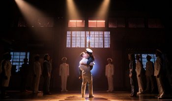 Into this landscape, director Taylor Hackford's movie An Officer and a Gentleman unleashed Zack Mayo, a headstrong young man whose life has been unkind to him. Zack is determined to realize his dream to become an aircraft pilot by way of the U.S. Navy's extremely rigorous Aviation Officer Candidate School. His stated reason: "I want to fly." The movie, released in 1982, hit a chord with a large public, drawing folks to cheer this unlikely hero's success in spite of it all, including the hostility of his merciless training officer. Along the way, he wins the heart of a local factory girl, his success promising a way up from life's lower rungs for both of them–landing them "Up Where We Belong," to quote the title of the film's Oscar winning song. It was a decent movie, and a good measure of the nation's pulse at that moment. The musical version, first launched in the United Kingdom, recently played at the Ordway Center for the Performing Arts for a four-day run. A jukebox musical without an original score, it uses a pile of pop songs from the period. As a jukebox musical that shoe-horns in songs that seem to contribute to the plot or reflect on a character's development, it is a mixed bag. Some of the twenty songs included do the job nicely: Hold on to Your Dream," "Never Surrender," "Every Girl in this Town," "I Can't Hold Back," "Lost In Your Eyes," "Right Here Waiting," "Precious Pain," "Hold On," and, yes, "Up Where We Belong" work well to at least support, if not actually move, the narrative. Melissa Ethridge's "Precious Pain" has an especially strong impact. But this is fewer than half the songs. Most of the others come across as background music, while a few, like "Venus," actually slow things down. Douglas Day Stewart, a prolific screenwriter, wrote the original screenplay for the movie, drawing on his own experiences as a Naval Officer Candidate dating a local factory girl in 1965. Stewart worked on the musical's book with Sharleen Cooper Cohen and Dick Scanlan, who also directs this production. Stewart and company have made some interesting changes from the film. For one, Zack's love interest, Paula, now has submerged ambitions to be a lawyer. Back in 1982, the movie Paula's ambition was to marry Zack–at least nothing more was mentioned. A secondary relationship between an Officer Candidate named Sid and Paula's friend Lynette is altered by making Sid a Black man, adding the challenge of a mixed race relationship, as well as how racism made life more difficult for Black officers. These changes perhaps are thought to bring the show in line with audiences' current interests by addressing racism and women's empowerment head on. Perhaps more notable, though more subtle, Zack Mayo is now depicted as the brightest and most physically capable of the students in his class. This somewhat diminishes his status as an underdog among his peers, making it a harder–or perhaps, more aptly, less important–to invest in rooting for him. We never have cause to doubt that he'll make it. Scanlan's direction serves the show well enough to clearly deliver its story, including a couple of flashbacks that depict Zack's difficult youth. The show shifts smoothly from one setting to another, with action sometimes going in two or more simultaneously. It's well paced well, moving through its narrative without ever losing steam, clear to the last scene which duplicates the film's iconic final image. Patricia Wilcox contributes choreography that veers towards athleticism as it demonstrates the candidates in their training routines. Pleasing as these choreographed workouts are to view, the show faces a pitfall by its very nature. This hard-working cast goes through the well synchronized movements as we expect to see dancers on stage–making it look effortless–so we lose a sense that these men (and one woman) are doing grueling work, that some will be less adept than others, and that some might not make it though. Its artifice shows. Sure, we can enjoy dancers pretending to be in military training, but it pulls us away from feeling a sense of their struggle to make it. The single case where the show zeroes in on a candidate's struggle is the lone woman, Seegar, who repeatedly fails to surmount a climbing wall. Yet, when she finally succeeds, it seems as if she gets over the wall that last time because the script told her to, and not because she did anything different. Whatever weaknesses the show may have, the (non-Equity) cast performs with total conviction. Wes Williams delivers a terrific performance as Zack, making his ambitions to fly for the United States Navy totally believable, and he sings with a strong, pleasing tenor. Mia Massaro matches him well as Paula, feisty and self-directed. She makes her rapidly growing tenderness for Zack feel believable, while maintaining her character's strength. Massaro, too, has a strong, lovely voice, especially put to good effect on "Right Here Waiting." Massaro and Williams have onstage chemistry together that also helps draw us in to them. David Wayne Britton gives a solid performance as Marine Gunnery Sargent Emil Foley, Zack's training officer and nemesis throughout the twelve week course. Less fearsome than Louis Gossett Jr.'s Supporting Actor Oscar-winning depiction in the film, Britton's take on Foley remains intimidating and tough, brooking no nonsense and no excuses–but he does show glimmers of appreciation for his students' efforts and individuality that serve to humanize him. Emily Louise Franklin and Cameron Loyal as Lynette and Sid, respectively, play well together in sifting through the hazards they face as a mixed race couple in 1981. They also sound great together while singing Debbie Gibson's "Lost in Your Eyes." Loyal also admirably depicts Sid's struggles to meet the expectations of his bullying father. Amaya White, as Seegar, conveys the grit one would expect of a short Black woman determined to pass muster in the era's white male dominate