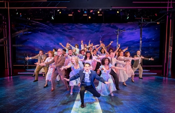 In 1998, Footloose re-emerged as a stage musical on Broadway. Pitchford collaborated on the show's book with Walter Bobbie, who also directed. They retained seven songs from the film, and Pitchford and Tom Snow wrote seven more to fill out the musical's score. The result was a more modest success than the movie, running a couple months shy of two years, but with tepid reviews it never rose anywhere near "must see" status. And yet ... all those catchy tunes, those gyrating dancers, that joy-affirming outcome of a community setting aside collective grief to reconnect with the spirit of its youth ... surely, that adds up to a massive good time, right? At Chanhassen Dinner Theatres, where a can't-miss new production of Footloose is breaking loose on its stage, the answer is a big "right!" The show, staged by director Michael Brindisi, delivers a heaping helping of entertainment, peppered with terrific choreography by Renee Guittar and a troupe of fabulous dancers, supercharged performances by its two young leads, and a pick-up truckload of heart, all on top of those can't-stop-humming-'em songs. It's a big winner. Footloose is based–very loosely–on the actual town of Elmore City, Oklahoma, where dancing had been banned since 1898 as a pre-prohibition attempt to reduce heavy drinking and teen-age sex. The ban held until 1980 when the town's school board voted 3-2 in favor of a student-led campaign to hold a junior prom, catching the attention of People Magazine. Pitchford picked up on that story, inventing a stuck-in-the-middle-of nowhere town called Bomont. The fictional Bomont had passed such a ban, pressed by the heavy hand of influential Reverend Shaw Moore, after four of the town's most promising teenagers were killed in a car accident while driving back from a dance. Hints that drinking was involved in the accident led to the conclusion that all that dancing led those "good kids" to succumb to the temptation of alcohol, and who knows what else? Enter 17-year-old Chicago transplant Ren McCormack (the Kevin Bacon role) and his cash-strapped mother Ethel, come to live with Ren's pious aunt and uncle after his father abandoned his wife and son. Ren is angry about his dad and about leaving Chicago, where life could be tough but he could at least let loose in the dance clubs at the end of the week. Not in Bomont. On top of that, Bomont is not used to strangers showing up, and everyone–the other kids and the adults alike–gives Ren a hard time. The adults assume that a kid from the big bad city has got to be trouble, and the kids assume that this city boy needs to be taken down a few notches. Then Ren meets Reverend Moore's foxy, rebellious daughter Ariel and the die is cast for change to boogie over Bomont's horizon. Yes, the story is a bit syrupy. Memory tells me it felt edgier in the mid 1980s, but with all that has transpired in almost four decades since then, it feels almost quaint. However, lubricated by the infectious songs, Ren's determination, and Ariel's righteous anger at her father's misguided efforts to "protect" her, it still plays really well. The show's humor comes courtesy of Ren's acerbic point of view, slow-on-the-uptake Willard who befriends Ren, and Ariel's friend Rusty who harbors a long simmering crush on Willard. The show's heart originates mainly from Ren, but radiates out to those who he affects with his relentless drive to bring joy back to Bomont. Brindisi has drawn aces for every one of his leads. At first glance, when Alan Bach strode out as Ren I thought he looked at least ten years too old to play seventeen, but in less than ten minutes he had me hooked, using every one of his talents–persuasive acting, spot-on timing, a great voice, and jaw-dropping dancing–to sell the goods. Maya Richardson, as Ariel, had me on board the minute she showed up. Her performance renders the necessary blend of rebel, dreamer, and wounded child that is Ariel, and she brings terrific vocals and hot dancing to the stage as well. When Bach and Richardson join voices on the love song "Almost Paradise," they seem not to be acting, but to be genuinely falling in love. Michael Gruber sells the goods as the starch-backed minister whose firm grip on the town keeps residents bound to his moralizing vehemence, better at having influence over his peers than over his daughter. Unfortunately, a powerful song called "I Confess," written by Pitchford and Snow for the stage musical as an eleven o'clock number to reveal Reverend Shaw's crisis of confidence in his beliefs, was cut from the show in 2005. That number let the audience into Shaw's troubled mind and made his final acts feel believable. Without it, the outcome seems a bit unfounded. Gruber does the best he can, given that limitation, to make Shaw's resolution of the conflict feel honest. Lynnea Doublette is winning as Shaw's wife Vi, who quietly defends her daughter and challenges the wisdom of her husband's stone-faced intransigence. Ann Michel's role as Ren's mother Ethel is small for the actor who typically excels in leads, but she brings the right blend of resignation to the downturn her life has taken and the essential drive to defend her son. Matthew Hall is endearing as Willard, and a good match for Shinah Hey, who aptly mines the sass and comic elements of Rusty's character. Ben Bakken captures just the right notes as Ariel's badass boyfriend Chuck, and in a role so small it amounts to a cameo, Kirsten Rodau is a hoot on roller skates as Betty Blast, proprietor of the Burger Blast drive-in. The entire cast and ensemble give their all to the dance numbers generously placed throughout the show. The proficient Andy Kust once again wields the baton as Chanhassen's music director, and leads the eight-piece band to solid renditions of the score, rock and rolling for the most part, but handling the tender musical moments with aplomb as well. Costume (Rich Hamson), set (Nayna Ramey, lighting (Sue Ellen Berger), and sound (Russ Ha