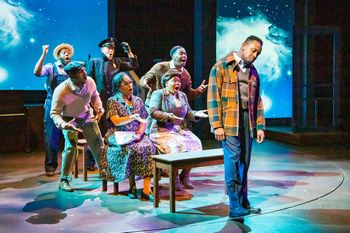 Parks wrote three memoirs during his life. This play is based on the first, "Choice of Weapons," published in 1966 and recipient of the Notable Book Award from the American Library Association. In this memoir, as in the play, we see Parks as a young man face the cruelty of racial prejudice, and how easily it can spiral into violence. Parks resists the temptation to enter into that spiral, choosing the camera instead of knives and guns to attack discrimination and hatred by exposing its truth to the American public. In this way, Parks is very specific to the origins of a boundary-breaking career. Yet the play can resonate with any young person's struggle to find a meaningful path in life, in particular to take the less often chosen road in the face of numerous obstacles, as did Gordon Parks. Rivers and Hickman-Winfield succeed handily in telling his story, beginning with Parks at age sixteen, sent from his childhood home, a farm in Fort Scott, Kansas, to live with his older sister and her husband in Minneapolis after his mother dies. Compared to rural Fort Scott, Minneapolis and Saint Paul had sizable Black communities. As the youngest of fifteen children, Parks had a special bond with his mother, who understood that he saw the world in different ways than most boys and would need a wider community of others who looked like him to find his footing. Throughout the play, his mother's care and confidence in him continue to be a source of strength. The printed program provides an excellent timeline of highlights in Gordon Parks' storied life. This is useful to flesh out the incidents depicted in the play, as well as to learn more about how Parks built upon those pivotal years to launch a remarkable career. The incidents in the timeline, though, depart from some of those enacted in the play. If anything, the trials and tribulations of his actual young adulthood were more numerous than depicted in the play; perhaps its creators felt the need to consolidate into a more compact storyline, even if it meant altering some facts. The timeline, for example, lists many jobs Parks held during his early years, but doesn't mention a stint at a diner as the first person of color ever hired by its white proprietor. That boss ends up being a great supporter of Parks' ambitions, underscoring Parks' mother's admonition that not all white people are bad. If that relationship is an invention of the playwright, it offers an opportunity to understand the workings of Parks' mind. For most of us, other than scholars of Parks' life and work, it is probably more important to appreciate the cauldron of his young adulthood and the influences and processes by which he forged a remarkable career than to be able to recite his biography. Talvin Weeks directs Parks, making excellent use of a revolving stage that fluidly takes us from one setting to the next. The abstract setting is the work of Seitu Jones (like Parks a multi-disciplinary artist), with a single raised platform and a stand-alone door frame serving a multitude of uses. Three framed screens set above the stage are hosts for video projections, created with care by Kathy Maxwell, that extend the environment and expand upon the issues. Costumes (Sarah Bahr), lighting (Merritt Rodriguez), and sound (Dameun Strange) all add to the well-integrated physical staging. Music is inserted throughout the play, with music director Darnell Davis at the piano. These are not original songs and I would not classify Parks as a musical, but the music–ranging from spirituals to pop ditties to folk music to jump jive–gives characters added opportunity to express their feelings and, especially in a well-staged party scene, to liven things up with sprightly dancing along with the music. Parks' singing of "Sometimes I Feel Like a Motherless Child" is especially moving, and the entire cast joins in on the folk song "There's a Hole in the Bucket," offering offer welcome comic relief while Parks expresses pent up anger at a racist society that doesn't allow people like him to ever win. Brown's portrayal of Parks is low key, without the declamatory roar we often associate with a groundbreaking personage, but this seems in keeping with Parks' introspective nature and his "choice of weapons." When he does feel rage, Brown shows us Parks' initial response to direct it inwardly before recognizing its source and finding his own strategy for addressing it. James A. Williams is a narrator called Pigeon Man (the elegant pigeon metaphor is made clear in the course of the play). The remainder of the cast play multiple roles and handily move from one character to another. Strong impressions are especially made by: Jamila Anderson in the guise of Parks' mother; Ivory Doublette as his first serious romance; Mikell Sapp portraying his soft-spoken father; Darius Dotch and Darrick Mosley as Parks' loyal buddies; and Pearce Bunting as all of the white characters, notably the sympathetic owner of that diner mentioned above. Gordon Parks went on to a career as both a fashion photographer and a socio-documentarian, including two decades on the staff of Life magazine, to author those three memoirs as well as the semi-autobiographical novel "The Learning Tree" and numerous books about photographic technique, and to publish collections of his photography. He also was a painter, composer, and notable filmmaker, following his breakthrough as the first African-American director of a major Hollywood studio movie (the film version of The Learning Tree) with megahit Shaft and its several sequels. That it all started in the Twin Cities, where Parks bought his first camera, had his first photo exhibition, and made, to the betterment of us all, his choice of weapons, gives his story added resonance for our hometown audience, but Parks would be worth seeing by anyone interested in how a young man can live through heartbreak, dispossession, discrimination and harassment without being broken. Parks does an excellent job 