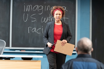 Yunia's remark underscores my own failure of imagination. When I heard Mixed Blood Theatre's final production for this season–and the final new production to be mounted under Artistic Director Jack Reuler's incredible tenure–would be based on over a hundred interviews with people in every part of the country, asking them to "imagine a United States without racism," I was disappointed. I envisioned a montage of pithy and poignant statements, recited by actors each assuming a series of personas, spouting out the myriad responses collected. While that could be an interesting exercise, bringing together the wide range of views on race–and particularly the role of race in our national life–I didn't imagine it having actual characters or any form of narrative to clutch at my attention. Fortunately, playwright and director Seema Sueko's imagination proves to be far more suited to this project than mine. Sueko, bringing her impressive array of credits at regional theaters around the country to the Twin Cities for the first time, conducted those interviews, then sifted out arguments, trends, patterns, types and perspectives to create seven characters, in addition to teacher Dee, who find themselves in a classroom where their assignment, written on a chalkboard with resolute energy by Dee, is "Imagine a U.S. without Racism." The students have been registered for the class by some omnipotent force, as if caught up in an episode of "The Twilight Zone," and at first resist Dee's efforts. Soon enough, though, one by one, they face their classmates and begin to describe, and then enact, their feelings about this daunting assignment. As one might expect, the seven students comprise a variety of racial, class and gender types. Kenji is a fourth generation Asian American banker, married to Khadija, an African American fundraiser for a nonprofit. Across the street in their gentrifying neighborhood a Trump flag flies, which especially makes Khadija uneasy. Lawrence is a white man, desperate for a loan to keep his small family farm afloat. Sally, a middle-aged white woman, insists she is not racist, though her notion of what constitutes racism is quite facile. Harrison is a Black police officer, tasked to address the changing patterns of crime on his beat. Birch is a white, nonbinary college student who lives in the basement of their family home, and is at odds with the attitudes and behaviors on the floors above him. Finally, Yunia is the Native woman, a victims' advocate with a capacity for seeing the big picture. Over the course of ninety compelling minutes, this septet unveil their thoughts about racism, sometimes stripping away–goaded by their teacher's sly instruction–their stated thoughts to unleash their actual feelings. As they enact occurrences from their lives, their paths cross and the characters begin to open up to learning about one another, to the possibility of breaching the chasms that keep them apart. The play also leads to the interface between race, class, and economics of American society, suggesting that they are too entwined to address one without the others. The play is not intended to be naturalistic. Yes, the situation is contrived and the characters handcrafted to represent a wide swath of demographics. As playwright, Sueko makes this artifice work by continuously using the glimpses of their lives as part of teacher Dee's repertoire of instructional tools, so that we don't feel unsettled when the play jumps back to the question facing these students. The classroom assignment, and not the intricacies of her students' lives, remains the central focus. This is accomplished with a good deal of humor, along with expressions of anger, fear, sorrow and compassion–though the last arrives only through the greatest of effort, not so different from real life. As director, Sueko draws out performances that–for the most part–convey authenticity in the ways the characters respond to one another, and the halting moves by which they consider change. Scenes meld seamlessly into one another, always bringing us back to the classroom and the assignment that must be completed before class can be dismissed. And–spoiler alert–class is finally dismissed. But the good news this implies is tempered with the harsh recognition that this is one classroom, one small group of people in a sea of Americans who have yet to be signed up for this course. In the role of Dee, Faye Price is at the center, a demanding instructor who pushes her students–and the play–to reach higher. From the start, Price gives a terrific performance, rising to the sublime when she allows herself to drift into remembrance of the one time in her life she didn't feel the weight of racism bearing down upon her. Tellingly, it was not in the United States. Of the other cast members, Kurt Kwan as Kenji, Michelle Barber as Sally, Warren C Bowles as Harrison, Lisa Suarez as Yunia, Jiavani as Khadija, and Terry Lynn Carlson as Lawrence (and briefly, as Harrison's white partner police officer), all stand out. Each have opportunities to shine in a particular scene that illuminates their perspective, while completely believable in their interactions with on another. Only Jayce Hanson, as Birch, seems less than fully present, coming across more as a type than a person. Whether this is in the performance or the way in which the character is written, it is the only weak link in an otherwise stellar ensemble performance. Joe Stanley's set greets the audience entering the theater looking like a typical community college classroom–except for the presence of blackboards, which have been replaced by the ubiquitous whiteboards. Perhaps that is intentional, as the sharp sound of Dee writing on the board with chalk would not be nearly as effective were it the timid squeak of a dry-erase marker. Classroom walls cleverly unfold to depict interiors of the students' homes, without them ever leaving the "classroom". Zahra Jangbar's modest 