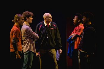 All American Boys tells the story of a Black teenager, Rashad Butler, who after mistakenly being thought to be stealing a bag of chips at a corner store, is assaulted by a police officer who interprets Rashad's attempts to explain his innocence as defiance and, ultimately, resisting arrest. Rashad winds up in the hospital with a broken nose, internal bleeding, and misdemeanor charges. It is equally the story of Quinn Collins, a white student who attends the same high school as Rashad. Quinn saw the incident take place, horrified as Rashad was pummeled by Paul, the cop. This is especially disturbing because Paul is the older brother of one of Quinn's best friends and a teammate on the school basketball team, Guzzo. Guzzo's family–especially Paul–took Quinn under their wing after Quinn's father was killed while serving in Afghanistan. Quinn struggles with how to balance his loyalty to Paul with what he saw happen with his own eyes. Stages Theatre Company, now in its 38th year and going strong, is a much heralded youth theater, based in suburban Hopkins, west of Minneapolis. Collaborating and mounting the show at the Capri was an inspired choice. The Capri is the last remaining theater in North Minneapolis, heart of the city's African American community. It reopened last year after a fabulous renovation turned it into a first-class performance space. The Capri is operated by Plymouth Christian Youth Services, a long-standing non-profit that delivers education, arts, and youth programming in North Minneapolis. To reach further toward an experience that tells both Quinn's and Rashad's stories with authenticity, the production is co-directed by Theo Langason, who is Black, and Cody R. Braudt, who is white. As in the novel, the play shows both protagonists in the context of a complete life, including family, friends, teachers and coaches. For Rashad that includes: his supportive mother and his father, whose exacting standards seem impossible to satisfy; his older brother Spoony who, working at UPS, definitely has not satisfied their dad's standards; and Spoony's politically woke girlfriend, Berry. Rashad has a tight group of friends: Carlos Greene, Shannon Pushcart and English Jones (Berry's brother). English and Shannon are both on the basketball team. Rashad also is affected by a wise, straight-talking volunteer in the hospital gift shop. Quinn's universe includes his hard-working mother, struggling to make ends meet since her husband was killed in action, and his younger brother Will, who often is left in Quill's care when their mom has to work a late shift. His closest friends are Dwyer and Guzzo, both basketball teammates, and he is forming a relationship with a girl named Jill. Then, of course, there is Guzzo's brother Paul. The two groups–those in Quinn's orbit and those in Rashad's–don't generally interact, except in the shared experience of the basketball team, with their coach constantly enjoining them to work together as one team. Both Rashad and Quinn are presented as candidates for the sobriquet "All American Boy." Both are good students, basically well mannered, and have avoided getting in any trouble thus far in life. We see how Rashad's hopes and future chances can disappear in a flash, through no fault of his, other than for being a Black male teenager, and we note Rashad's instinct not to fight back, just to make the trouble go away. Quinn, on the other hand, chafes against the expectation that he play the "All American Boy," feeling that he can never live up to his father's heroic legacy, to be everything his mother needs him to be, and do the right thing in the face of huge conflicting interests. This dual-track narrative pivots from scene to scene, creating a clear image of how both imbedded racism and the pressure placed upon boys to "be a man" deal a double-blow upon our males, whether they be white, Black, or any other color. Throughout the play, conversations among friends, between parents and children, and in classrooms are depicted with authenticity. When school officials try to contain the increasingly heated talk about the incident, a graffiti statement appears outside the school–"Rashad Is Absent Again Today"–that becomes a rallying cry for those outraged both by what happened to Rashad and attempts to dismiss it. The play's conclusion does not soft-pedal the difficulties that make progress halting, but does leave the audience with a measure of hope and a full heart, ready to continue the work of making a difference. The cast of (mostly) youthful actors, does a fine job bringing these many characters to life, with Miles Johnson as Rashad and Jaden Corniea as Quinn both outstanding in those two demanding roles. Roy Richardson Jr. is impressive as Spoony, rightfully agitated over the injustice done to his kid brother, well balanced by Joh Easley as Cherry, with an equal sense of the injustice but able to maintain a calmer demeanor in her response. Jamila Joiner as Rashad's mother and Danté Pirtle as his father both convey the very different, but equally fraught responses to Rashad's situation. Pirtle especially shows the great pain it brings his character to reveal a dark secret to his son. Other noteworthy performances are given by Jack Mintz as Guzzo, Edric Duffy as English Jones, Kim Kivens as Quinn's mother, Michael Venske as Paul, and Luca La Hoz Calassara as Carlos. The numerous named characters in addition to three ensemble members often, throughout the play, serve as a chorus, narrating plot points or reacting to developments on stage. At other times Rashad narrates. These might have become overly "stagy" devices, but are handled deftly by the co-directors, as are the transitions between scenes and the shift of focus from Rashad to Quinn and back again. Joe Stanley designed a clever set that transforms from one scene to another with ease, while Samantha Fromm Haddow's costumes serve each character well. The production benefits greatly from Grant 