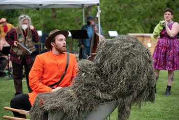 What Hair Ball has in common with last year's Log Jam, in addition to its venue and its creator, is the frolicking mayhem created by director Joel Sass, abetted by stage manager Brian Hirt, along with a performance by Maren Ward, in both cases playing, in male drag, a weird paranoid fella who upsets everyone else's equilibrium. In this case, the character is Jerry Loudermilk, dressed like a less fashionable Red Green (hopefully, you are familiar with the old "Red Green" comedy show on PBS, to which I refer). Loudermilk is a backwoods type who has seen evidence of a Bigfoot monster off in the woods, which manifests itself in the form of the titular ball of hair. The story is set in northwestern Canada, in a community economically dependent on the golf resort owned by the sinister Forbelius Dort (Tom Reed, also a Log Jam veteran), who enjoins mayor Sheldon (France Roberts) and wants to keep things quiet. However, not only does Loudermilk insist on hunting down the monster, but aspiring detective Winnie Von Highsmith (Abilene Olson), the adolescent daughter of snooty Patricia Von Highsmith (Georgia Doolittle), is determined to solve the mystery herself–pushing back on her mother's insistence that she abandon her goal of becoming a detective and learn proper etiquette as befits a socially prominent young lady. In the woods, Winnie encounters Canadian Ranger (not quite a Mountie, you see) Montgomery Ward (Luke Aaron Anderson), who is determined to show his mettle, while disavowing the existence of a Big Foot. Whew! And, for good measure, the cast of characters includes Elmer (Rick Miller), a flaky guy who hangs out around the golf resort, though I never was clear on his role there, and chanteuse Mimi Marmot (Lux Mortenson), who is never seen without her marmot puppet firmly wrapped around her hand and lower arm. Good thing, too, as the puppet is the source of much wisdom, such as the show offers any. Oh, yes, of course there is also the Big Foot character itself, who is dubbed with the far less fearsome name Little Toe (Rick Miller again, though you would never know it, beneath that mass of matted hair, without checking the program). There is a surprise appearance by one other character, but I won't be the one to spoil that delightful surprise. The story gets wackier as it goes along, so much so that when the entire forest, which had heretofore concealed Little Toe, goes up in flames–intentionally set as part of a golf course expansion plot–it is actually fun, with audience participation to boot. The tale incorporates a few somewhat serious notions: letting your children become themselves; the vacuous nature of much of what passes for high society; and the evils of corporate greed, especially when it imperils the environment. But there is no mistaking Hair Ball for a serious dive into any of these themes. Such an enterprise calls for a cast willing to tread the line between actual acting and hamming it up, sometimes stepping on one side of the line, more often on the other. Maren leads the way as Loudermilk, with a no-holds-barred performance that includes literally rolling on the floor. Reed knows his way around a gleefully over-the-top performances as well, playing an arch villain (as he did in Log Jam) who has a swell time being evil. Anderson plays his counterpart, the extravagantly earnest Ranger, who harbors a secret of childhood heartbreak. Olson wins hearts as the awkwardly spunky Winnie, intrepid to the end, and Doolittle mugs with aplomb as haughty Patricia Von Highsmith. Joel Sass gives the show the feel of a fairy tale being told. When characters enter on one side of the rooftop stage while others leave on the other side, you can almost hear a narrator's voiceover saying "Meanwhile, in another part of the woods"–though no narration is needed, for in spite of the lunacy, the plot is always made clear. The songs are forgettable, but earnestly presented, with Anderson, Olson, Doolittle and Mortenson displaying impressive vocal prowess. Sass incorporates some light dance movement, which livens up what is already an indisputably lively show. Costumes by Rubble and Ash further enhance the production, and the contributions of Anne Sawyer, designer of the Big Foot costumes, is immeasurable. Being outdoors, and on the roof, the show is given a unique form of "special effects" from birds swooping over the lawn/stage while much higher above, airplanes soar in take off or landing patterns, being not all that far from Minneapolis - St. Paul International Airport. The juxtaposition of natural and engineered flight seems like a perfect metaphor for these theater artists at work, using the artifice of dramatic structures to deliver a show that prompts one of our most natural instincts: laughter. The whole thing couldn't be sillier, which is just fine by me. There is a place for silly in our lives, and when it is delivered by a group of actors, designers, and director who are not only having a boatload of fun, but generously sharing that fun with us, I'm all for it. Also, Hair Ball is totally suitable for all ages, which can make for a nice family outing, combining time in the fascinating Bakken Museum (tickets allow for museum admission) along with live entertainment. Hair Ball, an Open Eye Figure Theatre production, runs through June 19, 2022, on the green rooftop of the Bakken Museum, 3537 Zenith Avenue S., Minneapolis MN. Bring lawn chairs or a blanket. Tickets: adults $30, students and seniors $25, children 12 and under $20, a limited number of economic accessibility tickets $15.00. Unsold tickets, if any, are available at the door on a pay as you can basis. For tickets and information, please visit openeyetheatre.org/ or call 612-874-6338. Book, Music and Lyrics: Josef Evans; Director: Joel Sass; "Megapaw" Designs: Anne Sawyer; Costumes: Rubble & Ash; Sound Design: Rachel Anne Brees; Arrangements and Music Direction: Spencer Chandler: Stage Manager: Brian Hirt. Cast: Luke Aaron David