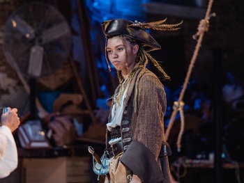 When I first read about Pyrates–the story of 18th century pirates (using the archaic spelling) as a motley band of gender and racially varied buccaneers–I envisioned a lark, freewheeling play on stereotyped pirate motifs, replete with arch anachronisms and low bawdiness. Turns out, I was far off base on that one. Pyrates is based, in part, on historical truths, including the reality that pirate crews often comprised gender and racial diversity. As the play enfolds, that seems patently sensible, as individuals who found their way to piracy were often those on the fringes of society who were not accepted in their traditional communities. Captain Henry Morgan, once the most feared plying the Caribbean Sea who died a very wealthy, slave-owning man as Governor of the British colony of Jamaica, is a central character. The story spins around a young, gender-fluid pirate named Tanith, part of a crew of sailors impressed into service on a Spanish ship by led by Captain Vidal. Among others, Tanith's mother, Trix, has also been pressed into service on the ship along with a French sailor named Bouchere. When mutiny is plotted against Vidal, Tanith and Bouchere emerge as leaders of different factions. Tanith wants take over the ship, imprison Bouchere, head to Jamaica, and turn Vidal and the ship over to Governor Morgan. In exchange the Governor would issue Tanith a letter of Marque, a document that turned pirates into privateers, whose attacks on merchant ship, theft of cargo, and imprisonment of crews were no longer called crimes, but done in service to their king, a way for pirates to go "legit." Vidal proposes killing Bouchere and then scoring a treasure haul big enough to retire on, and to return to the wife and child he left behind. Tanith prevails, and the remainder of the play's two acts presents an account of the duel of wills between Tanith and Captain Morgan, and the dangerous mission Morgan assigns to Tanith as a way of proving mettle and earning the coveted letter of Marque. Trix, whose affirmation of life has enabled her to survive a host of dangers and treachery, serves as a moral compass for Tanith, while a translator, Corbin, sent by Morgan to aid Tanith in the attack on a Spanish treasure ship, demonstrates conflicting ambitions. The end follows the lines of historical record, at least as concerns the infamous Morgan, referring back to a line spoken earlier in the play, that "memory gets owned, but history gets interpreted," challenging the audience to interpret the surprising bits of history laid out before us. The actors showed commitment and ensured that none of these characters play as mere "types." Joyce was wonderful as Morgan, bragging about living a life that allowed him to become both fat and old, which he convinces us are quite desirable aspirations. Taelyn Gore drew in our rapt attention as Tanith, revealing the pensive and courageous parts of Tanith's character in equal measure. Meri Golden, an actor I have never seen make a false move, is again marvelous, this time as the bawdy survivalist, Trix. Alec Berchem was splendid as Bouchere. In a scene where his life is imperiled, I felt near compelled to jump on stage and rescue him myself, so real were his protestations. Joshua McCauley as Corbin and John Goodrich as Vidal did fine work to bring their respective characters to life. Stone had Pyrates in the works in the "before times," so he had time to develop the piece before bringing it to an audience. For a new work, it did have a polished feel, though the bare-bones (as opposed to skull and crossbones) staging allowed it to also have a rough edge, in keeping with its subject matter. There were sweet and effective touches, such as a pair of chess games played out between Morgan and Tanith, repositioning themselves to gain the upper hand in their negotiations as they repositioned their chess pieces. The play was performed on a large thrust stage, surrounded on three sides by a single row of seats, accommodating a full house of about thirty-six. Michaela Lochen's amazingly simple but wonderfully evocative set consisted of three boat hooks hung from the ceiling, each with a pair of heavy ropes that, when tossed down and tied to either side of the stage, became the perimeter and rigging of a ship at sea. A large barrel along with a couple of smaller barrels and several wooden crates (from which props are handily drawn throughout the show) were rearranged as needed to create a ship's deck, Morgan's office, a rough dockside tavern, and other settings. Chelsea Wren compiled costumes–compiled, as they seemed put together from the treasures of local thrift shops–which made totally believable pirate garb, though the no-hold barred costume worn by Brian Joyce as prosperous Captain Morgan seemed to have been truly designed, as was the luxe coat that marked Tanith's transition from renegade pirate to Morgan's emissary. Mark Kieffer's lighting drew focus and created the necessary effects, including a startling moment of shipboard distress, aided by sounds from four musicians who accompanied the cast as they sang traditional pirate shanties while changing sets, which consisted mainly of climbing a rolling staircase to lower or raise the ropes. The robust musical interludes smoothed the transitions, but moreover provided both cultural and historic context for the story being played out. Sadly, I was unable to make the first week of Pyrates's two week run, and cancelled performances due to excessive heat (the rehabbed old fire house venue apparently lacks air conditioning), I attended on closing weekend, so you will be reading this after the Pyrates ship has sailed away. It was a worthy last hurrah for a scrappy company that never failed to imbed their work with imagination and intelligence. I hope that in some future season I find my way to Chicago and discover that Theatre Coup d'Etat has risen anew. There is certainly a great deal of life left in James Napoleon Stone's artistic