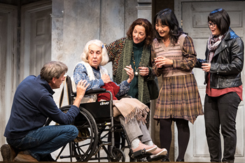 The feeling of looking at the peculiarities of our species with an almost clinical perspective is peppered with a treasure trove of humor, poignancy, and harsh truth in Stephen Karam's Tony Award winning play The Humans, now mounted in a splendid production by Park Square Theatre. The occasion of the play marries two of our most salient American traditions: Thanksgiving dinner and passing down the duties of hosting family gatherings from a generation of parents to their now adult children. These two concurrent rites take place in a bare-bones two story basement apartment in New York City's Chinatown, the two levels connected by a tightly twisted spiral staircase revealed, in Erik Paulson's spectacular set, in cutaway manner, so that we truly see a "slice of life," floor joists and all. Erik and Deirdre Blake have driven from the Scranton, Pennsylvania, home where they raised two daughters into Manhattan, along with Erik's mother, whom they call Momo, and who now lives with them as she glides ever more deeply into dementia, into the city where daughter Brigid and her boyfriend Richard Saad have picked up the mantle as holiday hosts. Brigid is an aspiring musician, biding time waiting on tables, while Richard is a graduate student in social work. The other Blake daughter, Aimee, is an attorney. She has taken the train up from her home in Philadelphia, though without her long-time partner, who recently broke of their relationship. Brigid and Richard just moved into the roomy apartment, their first together. They are excited about it despite a variety of loud and strange noises that enter the space, and the shortage of windows. Brigid points out that in New York you give up sunlight for space. The movers have been delayed, so their dinner is being served on paper plates, eaten on folding tables and chairs, adding to a sense of family dynamics being stripped to the basics. There are amusing efforts to maintain beloved customs, though the strain of adapting these to constant change is felt. Everyone tries to avoid unpleasant subjects–after all, it's a holiday, a time to give thanks. Still, unpleasantness does surface. Why should the Blake family be different from most others? The Humans is one of the rare Broadway plays of recent decades to launch a national tour, which had a week-long run at the Orpheum several years ago. While that production was excellent, the play works even better in the intimate environs of Park Square's Proscenium Stage, where we truly experience the closed-in feel of this basement domicile. Director Lily Tung Crystal maintains a steady flow of the interactions, sometimes simultaneously on the apartment's two levels, capturing a family trying to nurture and express devotion for one another while striving to avoid opening past wounds and dodge forbidden topics, such as Diedre's insistence that she will not push her Catholicism on her adult girls, even though she did bring a statue of the Virgin Mary as a housewarming gift. As families are wont to do, present company splits off into twos or threes who then discuss the others in hushed tones meant to infer their good intentions. Along with provoking frequent laughter, Karam embroiders these characters with lovely touches, such as Brigid calling her father "big guy," and grating ones, as in Dierdre's inability to refrain from repeating the obvious, that Brigid and Richard are cohabitating absent the sanctity of marriage. All this leads, in the play's 95 minutes, without intermission, after much drinking, reminiscing, teasing and truth-telling, to a surprising turn. The final minutes of the play take a very different tone as one of the characters dares to break out of the familiar scaffold of their constructed lives. We won't know where it leads–unless playwright Karam has a sequel in mind–but just the act of taking a chance, stepping into a long-avoided corridor of uncertainty, is both chilling and inspiring. Everyone in the cast does top drawer work. John Middleton, as Erik Blake, and Charity Jones as his wife Diedre are both fine actors who can be expected to give excellent performances, but being that they are married in real life, they bring an additional sheen of being in sync with one another, an ability to anticipate the other's words or actions and therefor have a response always at the ready that feels completely true and not staged. Dexieng "Dae" Yang as Brigid and Laura Anderson as Aimee bring vibrant authenticity to their strong bond as sisters, and to the complicated relationship each has with their parents and the parental expectations always hovering above them. Darrick Mosley brings chipper enthusiasm, with an eagerness to please, to his performance as Richard. As Momo, Angela Timberman makes the most of the limited sections of the play when she is not in a stupor, or crying out random words and phrases that convey no meaning but are nonetheless foreboding. The soundscape of the apartment, with noise coming from outside on the street and from within the bowels of the building, plumbing that seems to feel a need to announce its every act, the whirring of kitchen appliances, and an intrusively heavy-footed upstairs neighbor, is a significant part of the play, and masterfully produced by sound designer Katherine Horowitz. Karin Olson's lighting design aptly depicts the shortening days and darkening sky of late November, as seen through the apartment's lone window, along with the pools of shadow and light within the subterranean home. Matthew LeFebvre's costumes and Andrea Moriarity's wigs reflect each character's personality and life history. Park Square has given a fair amount of press to the fact that the daughters, Aimee and Brigid, in this production are both played by Asian-American actors, considering them to be Korean adoptees. The text has not been altered in any way to reflect this. Director Crystal has stated that an important consideration is representation of all types of families, including i