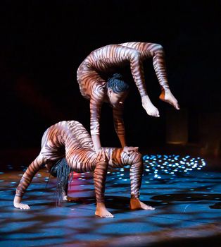 A scheduled return in fall of 2021 was cancelled due to COVID-19 as well as visa difficulties travelling from their Ethiopian homeland. Those barriers have been surmounted, and Circus Abyssinia is back in Minneapolis, with the American premiere of their newest program, Tulu. The troupe has new routines and some changes in cast members, but remains every bit as thrilling and inspiring as on their previous visit to our shores. Tulu is named in honor of Derartu Tulu, an Ethiopian track star who, at the 1992 Summer Olympics in Barcelona, became the first African woman to win an Olympic gold medal, which was for the 10,000-meter race. Not only did she win by a wide margin, but rather than taking the traditional solo victory lap, Tulu waited for Elana Meyer, running behind her for the silver medal, and the two took a victory lap hand in hand. This was momentous because Meyer, who is white, was running for South Africa. The 1992 games were the first Olympics in which she was able to complete, having qualified since 1984 but denied because of the Olympic boycott of South Africa while its notorious policies of apartheid remained in place. Those policies were abolished in 1991, allowing Meyer to finally compete. Tulu's gracious gesture toward her white South African competitor was seen as a symbol of new hope for all of Africa. Since 2018, Tulu has been president of the Ethiopian Athletics Federation. Without doubt, the display of discipline, concentration, and perseverance needed to perform the acts in Circus Abyssinia: Tulu would give anyone hope for what the human race can achieve. Those qualities are embellished with imagination and artistry, to provide entertainment that prompts the audience to gasp at its daring while being uplifted by its beauty. Tulu opens with a re-creation of the track star's first Olympic win–she was to win two more, another gold in 2000 and the bronze medal in 2004. This homage to an extraordinary woman seamlessly transitions into the first circus act, a solo woman contortionist, whose poise, agility, and self-confidence may well be an extension of Tulu's presence. An array of acts follows, with displays of hand vaulting, a contortionist duet, hand balancing, roller skating (at breakneck speed on a disk that looked no more than six feet in diameter), ensemble roller skating, and hoop diving, followed by flaming hoop diving, followed by flaming juggling–whew! There is also hoop twirling (try spinning sixteen hoops up and down your body at the same time), aerial acrobatics that are both daring and graceful, and Icarian games, which basically is human juggling. The latter must require extraordinary strength, balance, and trust in your fellow performers. Last is an act called Russian Swing. A large apparatus swings back and forth, carrying gymnasts who leap from it at its apex, and do summersaults, twists, and other stunts before landing. Every one of these acts is incredible, completely capturing the attention of audience members of all ages. Throughout each act and during scene transitions, recorded Ethiopian pop music–said to be some of Tulu's personal favorites–are played by performers including Betty G, Abbush Zallaquaa, Jana Band, Gigi, Dawit Tsige, Mahmoud Ahmed, Gash Abera Molla, Anteneh Minalu, Esubalew Yetayew, Mitku Bekele and Endegna–names that will mean little to most of the audience, but nonetheless engage us with pulsating rhythms and intoxicating instrumentations. While the acts are developed by those who perform them, the entire program is constantly in motion, with sensuous choreography by Tamrat Ejeta and Binyam "Bichu" Shimellis, culminating in a splendid finale scene. The movement is set ablaze by the colors and patterns in Feven Alem's costume designs. Mark Whatmough's lighting design builds upon the intensity of the acts, often bathing the stage in darkness while cones of yellow light home in tightly on a performer, other times use multi-colored footlights to create a carnival feeling. The entire spectacle is written and directed by Binyam "Bichu" Shimellis, who gives a sparkling, gyrating gem of a production. Some of my friends, when told I would be going to a circus, scoffed that they do not care much for circuses. Most were allayed when I told them there are no animal acts and no clowns, though there is a wee bit of light clowning around to lighten the almost continuous tension that comes from watching people do the impossible. While Circus Abyssinia: Tulu does not provide a narrative, other than celebrating the life of a national hero, it steadily builds a positive, even inspiring, atmosphere. For a nation where circus arts were unknown forty years ago to produce this marvelous display of those arts, performed at the highest caliber of athleticism and artistry, is itself a narrative, a story of belief, endurance and achievement that cannot be told too often. Aside from that, it is just plain awesome. Circus Abyssinia: Tulu through October 23, 2022, at the Children's Theatre Company, 2400 Third Avenue South, Minneapolis MN. Tickets are $34.00 - $79.00. Wheelchair seats available for $25.00 for adults, $15.00 for children 17 and under, seniors 62 and over, and military personnel. Ten percent discount for purchase of six or more tickets. For tickets and information, call 612-874-0400 or visit childrenstheatre.org. Best enjoyed by all ages. Written and Directed by: Binyam "Bichu" Shimellis; Choreographers: Tamrat Ejeta and Binyam "Bichu" Shimellis; Costume Design: Feven Alem; Lighting Design: Mark Whatmough; Company Manager and Stage Manager: Gabriella Cooke. Producers: Mehari "Bibi" Tesfamariam and Binyam "Bichu" Shimellis. Cast: Daniel Amera, Bezawit Ashagre, Etsegenet Ashenafi, Betelhem (Betty) Dejene, Cherenet Dereje, Befekadu Esmael, Zenebe Fantu, Fitsum Fekadu, Dagmawi Fekeru, Semeret Getachew, Zenebech Kassa, Alemayehu Mulugeta, Ezera Nigusse, Bichu Shimellis, Bibi Tesfamariam, Behaylu Tesfaye, and Kdus Yohanes. |