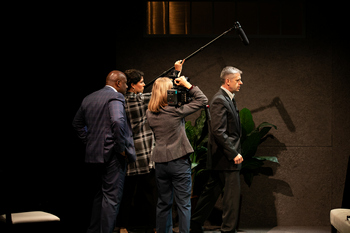 In each of those scenarios, I can try to imagine how I might feel and what it would take to forgive. I could never be sure unless I faced the real situation, but I could at least conceive of how I might, under the right circumstances, be able to forgive. Five Minutes of Heaven pushes the question to the extreme: Could you forgive a total stranger who murdered your nineteen-year-old brother at point blank range, decades years ago, when you were a mere child of eleven? You saw it all. Your life has been haunted by the sight, wrenched by your loss, and burdened by your mum's irrational accusations against you for not having stopped it. Could you ever forgive the man who fired those shots? Five Minutes of Heaven is a gripping, emotionally wrenching play being given a stellar world premiere production by Illusion Theatre. It was written by Michael Egan who also acts the part of Joe Griffin, the young witness, now a late in middle-age man, being asked to forgive. The play is adapted from a screenplay by Guy Hibbert for a 2009 film by the same name, directed by Oliver Hirschbiegel. The film was made to be aired on British television, though it was screened at the Sundance Festival where it won awards for direction and screenwriting. With two prominent actors, Liam Neeson and James Nesbitt, in the leads, it ought to have received some traction in the States but failed to do so. Egan has condensed the 90-minute film into a taut 75-minute-long one-act. It starts, as does the film, in Northern Ireland back in the 1975, the violent period called "the troubles," with Catholics rallying behind the Irish Republican Army (IRA) waging war in the streets against Protestants who unite under the banner of the Ulster Volunteer Force (UVF). Our view alternates between young Joe Griffin, a Catholic lad, idly practicing shots with a soccer ball outside his house, and seventeen-year-old Alistair Little (Pearce Bunting), describing the carnage he sees all around him and the irresistible urge to join up with the UVF and repay the IRA devils with his own hands. As he puts it, you don't think, in those circumstances, about how they may have suffered, only about your own suffering and loss–and hate. They count for nothing more than a target for your hostility. Alistair is delighted to be given a job by the UVF–to shoot a young Catholic man named Jim Griffin, just for the "crime" of being a Catholic, and to serve as a caution to the IRA. He is apprehended and serves time in prison, which affords him the opportunity to repent for his actions. Upon his release he writes about his transformation and becomes a noted author, public speaker, and professional "peace maker." Forty-five years later, the producer of an American reality television show called "One on One" has the idea of bringing Jim and Alistair together for the first time, so that Alistair can make his apology directly to Jim and Jim can publicly forgive his tormentor. That's the idea, anyway. Both men agree to appear on the show, but when the day arrives, both are very nervous. Alistair has lived racked with guilt. He knows that making peace with the victim of his own acts is a far cry from acting as a third party, counseling others to resolve their conflicts. Jim knows he will face the man he blames for sentencing him to a failed life. He does not understand how he can be expected to forgive. The producer (Laura Esping) offers glib words of comfort and reassurance to both gentlemen, but spews them out with an aggressive authority that speaks not of concern for either Alistair or Jim, but for making compelling television. The handsome interview host (Ansa Akyea) has the intelligent, well-spoken demeanor of someone well-skilled with words, though he may be out of his element with feelings. A kind production assistant (Shana Berg) is the most open of the lot, genuinely feeling Alistair's jangled nerves and Jim's morbid self-deprecation. We sense that she fears nothing good will come of this but does not have a capacity to intervene. All five actors are exquisite, each projecting the part they play in this madly conceived exercise that attempts to transform the vicious past that weighs down the hearts not only these two men, but of two entire communities, into a feel-good moment, a jolt for the ratings. Egan, as Joe Griffin, is especially compelling. He never suggests the slightest hint of being an actor on stage, only a man who suffered a life-altering tragedy, and who has been drafted into an international spotlight beyond his ken. Nearly matching him in power is Bunting's portrayal of Alistair Little. His sturdy, solemn exterior expresses painfully earned wisdom, while serving as a shield for the unresolved miasma of pain that is his constant companion. Esping is perfect as the driven producer, Akyea captures the essence of every glib television interviewer I've ever seen, and Berg conveys tenderness, insightful but lacking agency, as the production assistant. Robins has directed the show with a loving hand, never backing away from the fierce elements, but ensuring that we feel the humanity that animates both Alistair and Jim. All design elements are effective, appropriately taking a backseat to the stark drama. Eric D. Howell, credited as film and video coordinator, has assembled evocative footage depicting both the violence and the weariness of those on both sides of who lived through that long, dark, recent past. Howell also served as the production's fight coordinator, demonstrating skill in that regard as well. There is truth to the opening part of Five Minutes of Heaven, in that both Alistair Little and Jim Griffin were real people (were, because as noted in the program, Jim Griffin passed away on June 1 of this year). Alistair Little did kill Jim Griffin's brother, serving twelve years in prison for his crime, and Jim did see his brother being shot. Little did indeed emerge from prison as a man of peace, and wrote a book, "Give a Boy a Gun: One Man