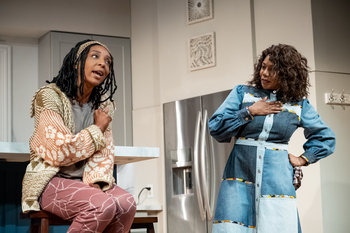 Rivers' new play is that rare creation not based on a book, film, historical event, biography, or memoir. He was inspired in 2018 after coming across a New York Times piece on Black infant and maternal mortality rates and the enormous disparity between Black and white patient outcomes. Despite having some of the most advanced and acclaimed medical facilities in the world (including Mayo Clinic, just ninety miles down the road from Penumbra), the lack of access to health care in low-income communities of color, and the prevalence of comorbidities in those communities place the United States near the bottom among the wealthiest nations. Floored by this knowledge, Rivers initiated a conversation with Sarah Bellamy, president and CEO of Penumbra, which gestated through a development phase, a COVID delay and at last has given birth to Weathering. Weathering is far from a screed railing against discriminatory practices, systemic racism, and intolerable discrepancies, although it does find its place to make those points in a dramatically appropriate context. The play is the story of a woman torn asunder after the stillbirth of a daughter she and her husband were ecstatically awaiting. The loss is devastating to husband Nathan (JuCoby Johnson) and wife Lena (Vinecia Coleman) alike, though the story is seen through Lena's perspective, and indeed she carries an additional burden, not only grieving a child but also coping with the feelings of being tragically let down by her own body. Lena has had it with people telling her how sorry they are, bringing flowers when they don't know what else to do, and filling silences with their condolences, questioning what is a condolence, anyway? And yet, she feels abandoned, utterly alone, and without hope. Lena has retreated from the world, isolated in her spacious, updated kitchen (teal and pewter, large island counter, recessed lighting, stainless fridge–superb work from set designer Chelsea Masteller Warren) with occasional night forays into the backyard to stare helplessly at the stars. Nathan has returned to work, which provides cover for him to avoid communicating directly with Lena about their shared tragedy. Despite the deep sorrow surrounding this story, it most often takes the form of a comedy, with a passel of woman appearing–sometimes magically–in Lena's kitchen, each with a different role in Lena's life, different ways of offering her comfort, and in some cases of driving her nuts. We meet Lena's overbearing mother (Greta Oglesby), her quick-witted sister Nicco (Ashwanti Sakina Ford), her wine-toting best friend Jo (Oyeman Ehikhamhen), a well-meaning but ditzy neighbor named Turtle (Ashe Jaafaru), and a casserole-bearing church lady (Austene Van), whose name–Margaret Wilson–and southern drawl bespeak an old-school point of view. First one at a time, then in pairs and eventually as a crowd, they chip away at Lena's protective layer of ice and form a web of nurturance, understanding, and cathartic release. Lena's turn-of-the-corner is abetted by a supernatural occurrence, yet the calm with which these women carry on offers the appearance of lives lived, expecting forces beyond understanding to be regular visitors to their days. Each of these characters emerges as an authentic human being, the result of smart and authentic dialogue Rivers has written for them, Colette Robert's fluid direction that never drop a beat, and the complete commitment of these actors. As Lena, Coleman (a formidable Lorraine Hansberry in Pillsbury's Jimmy & Lorraine: A Musing a few seasons back) cements her stature as an actor to seek out. Lena's pain is visible in her face and posture as she contends with the burden of dealing with both her own grief and these would-be givers of comfort. Oglesby, who makes great performances seem effortless, is spot-on as an interfering while only-trying-to-help mother, who makes the purchase of a set of luxury bedsheets both a passive-aggressive and tenderly thoughtful gesture. Van's take on the stereotypical church lady, buoyed up high by her service to others, is a spot-on delight. Jaafaru, who has a gift for disappearing into the roles she plays, accomplishes the same as Turtle, causing us to want to know more about this curious woman who seems always a step or two behind what is happening. Both Ehikhamhen, as Lena's empathetic friend, and Ford, as a younger sister who wraps her affection in barbed rejoinders, create women of keen intelligence, compassion and self-assurance, whom any person suffering as Lena suffers would be grateful to have beside them. Johnson is likeable, which comes so naturally to him, as Nathan, while conveying the reticence of a man trying to be supportive of his partner's feelings while struggling to contain his own. One wishes he had more to do in Weathering, though of course, the nurturing community formed by women is the core of the play. (Perhaps a different play could consider the absence of such community for so many men). Yet it is only when Lena and Nathan find communion with one another that they are able to move beyond their heartbreak. Rivers leaves us with the hope of this happening. Indeed, Weathering can be seen as almost a "how-to guide" on surrounding yourself with the right team of exasperating but loving people as windbreaks while you allow your worst feelings to surface in order to weather the harshest of life's storms. Speaking of storms, Kathy Maxwell's lighting design and Ahanti Young's sound design contribute mightily to the production's success, creating indicators of foreboding that are diametrically in contrast with Warren's stylish set. Trevor Bowen has dressed the actors in costumes that perfectly suit each one, with special props for the church lady's country-patchwork styled dress, and Lena's formless, engulfing sweater. While the infuriatingly higher rate of stillbirths, miscarriage, and other threats to infant and maternal health among African Americans in our nation dese