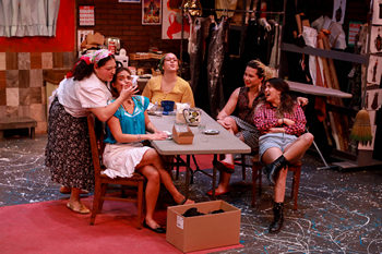 The play peeks into the experiences of five Latina women: the owner and four employees of a tiny dress manufacturing company tucked away on a dangerous block in East L.A. It is sweltering and the building lacks air-conditioning and has no ventilation, save in the bathroom. Estela, the owner, refuses to leave the door open to catch what little breeze there is, for fear of la migra (the Hispanic term for the immigration enforcement police) she believes are staking-out her building. Three of Estela's employees–her mother, Carmen, a font of unsolicited advice and criticism; Pancha, thirty-one years old, hard-nosed while harboring private despair; and Rosali, literally starving herself to slim down to a size two–have just obtained amnesty. The fourth employee is Ana, Estela's sister, who just turned eighteen so is now eligible for amnesty as well. Estela, however, is afraid to apply for amnesty. She is heavily in debt for the purchase and maintenance of her factory equipment and fears that if la migra learns of her debt they will deport her. If she is deported, the others will lose their jobs, too, a dilemma for them all. If Estela can get her team to produce one hundred dresses for a very demanding customer by the end of the week, she will be paid for that order as well as previous orders for which payment was withheld because of late delivery–enough to cover her debt. It is a lot to ask, given the heat (occasional radio reports mention record temperatures above 100 degrees), unreliable equipment, and everyone's nerves on edge, in part over la migra. Even those who no longer need be fearful have not yet broken the habit of being terrified. Then there is Ana, with a severe case of "bad attitude." She just completed high school, with plans to go to college, but needs to earn money first. She is a vocal feminist and scornful of women like her co-workers, who derive their self-esteem from the approval of men and who accept the lowest rung of the ladder rather than striving for more. Pancha is peeved at being asked to work extra hours since Estela owes her back-pay for many hours already worked, and Rosali's stamina is compromised by her obsessive dieting. Carmen hints resentment that she, the mother, is working for Carmen, the daughter, as if it violates the natural order of the universe. Estela is thirty-five and of large carriage. She knows that her mother believes she needs to be successful in business because she has missed her chance to get married. Carmen confirms this on a regular basis, chastising Ana to watch her weight so that she doesn't end up like Estela. All of these women (save Ana) have issues of shame about their weight and their bodies, which are tied deeply to the things Ana continues to rail about. When these issues finally come to a head, it is in a glorious catharsis that makes the entire play worthwhile. The production does a good job, under co-directors Lelis Brito and Adlyn Carreras, of introducing each of the play's characters and gradually establishing the connections among them. Despite frequent sniping at each other, they have an understanding of one another's challenges, some stemming from constraining historical and cultural patterns, others from the brutal reality of their place in a capitalistic world order. While Ana has the fresh vision to challenge this, she needs to grow into an appreciation for the groundwork done by those who preceded her, merely by surviving and bringing Ana and her ilk to this point in history. Bethmari Márquez is thoroughly authentic as rebellious Ana. Through the device of reciting her journal entries as she writes them, we get to know her best of all. She reveals, a bit at a time, a growing understanding of the cultural and historic ground in which her ideals of liberation must take root. Alice D. Piar Acevado offers a moving portrayal of Pancha, a woman striving to maintain her dignity working under intolerable conditions for far too little pay, and also grappling with her failure to succeed at what she has been inculcated to believe is the ultimate measure of a woman's worth. Xochi de la Luna is winning as Rosali, expressing the heart of a woman who can offer love to everyone but herself. Abigail Chagolla's Estela seems, in the early going, too unsteady to believe she has kept her business afloat under such harsh circumstances even this long, but as the play gathers momentum toward its final destination, we see her bloom with confidence and an understanding of her own worth that unleashes genuine joy. Mariadela Belle Alvarez conveys the trope of a well-meant but overbearing and intrusive mother, rounding the edges to avoid descending into stereotype. However, she appears far too young in body, voice and movement to convince as a woman over fifty who has borne eight children and complains of aching muscles. This diminishes the authenticity of the key interactions between a mother and her grown daughters. The production values are first rate, with an atmospheric set by Mikha Alemán that creates the dreary space in which these five women work their lives away, with clever use of movable elements to create a bathroom and supply room to which characters retreat for rare moments of repose or release. Props designer Kat Walker must have worked overtime herself to fill the space with such an enormous array of fabrics, sewing equipment, tools and notions. Anna Brauch has gotten the costumes just right, down to the underthings. Eric M. C. Gonzalez provides the sounds of traffic and sirens, along with appropriate music, and Shannon Elliot's lighting informs us of the passing of long workdays shifting into overtime-working nights, and back to face exhausted mornings. You may very be familiar with the 2002 film version of Real Women Have Curves, which was an unexpected hit and made a star of America Ferrera as Ana. Its screenplay was co-written by playwright Josefina López with George LaVoo, with added characters and plot developments, i