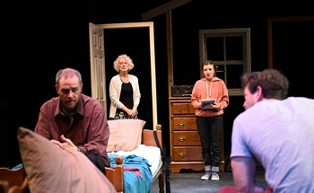 For Tim, the untethered life was not a choice. He was laid off from his job and divorced by his wife, and without finding other work, moved back home where he cries himself to sleep every night. To be honest, we don't know to what extent he contributed to his downward spiral. Was he actually "laid off," or was he fired? Did he give his wife cause to turn him out? By appearances, his efforts to find new employment seem less than whole hearted. And there is that bottle of booze he keeps hidden in a dresser drawer. We don't really know, but Hansen's heartfelt portrayal of Tim draws upon our sympathies, and we want to believe he is blameless. Tim's plan to improve his image as a father in his daughter's eyes by reading "Jane Eyre," the book currently being taught in her AP English class, so that he can have meaningful conversations about it with her, impresses as an earnest, if perhaps facile, effort, whereas, we might have instead focused on the question "so, what kind of father has he been up till now?" Even in the battle of the beds, I found myself on rooting for Tim. Ron was not cast out, but rather chose his plight. He left his wife and teenage daughter, who have tolerated his depressive moods and his affairs, when his wife received a grim medical diagnosis. Clearly that is just the straw that broke his weary back. It seems he has been despondent all of his life. A devoted wife and daughter, and a professional career (he has a dental practice) are not enough to draw open the drapes of gloom that encircle him. Looking at him, we see an emotionally stunted boy in a man's body, as when his mother Susan (Linda Kelsey, superb) refuses to allow him a slice of pie from her refrigerator, and he whines "Ma, why are you so mean to me?" in the voice of a fourteen-year-old. Later, he admits to still having the same dreams and desires as when he was thirteen and played out scenes of the adult life he hoped for while staring at the ceiling above his childhood bed. While we are aware of Ron's flaws from the start, Hopman delivers an open window into the pain that has always been his companion, so we can understand that he has learned know other way to conduct his life, or to conquer that haunting pain. Susan, the mother who raised both of these boys on her own after her husband died when the boys were only 8 and 9, clearly has struggled to do what was necessary, which included going back to work and providing for her family. It was a burden she didn't expect or want, but she soldiered on and did what was necessary. Now she is retired, trying to make a life for herself free of encumbrances, which does not include mothering two grown men. She can't even consider the question of whether or not she loves them, only that she raised them and had put whatever instincts or impulses enabled her to do that to rest. Kelsey gives Susan a tough veneer, which she needs in order to meet whatever the rest of her life has to offer. But within the hard heart with which she manages her sons is a well of love, which she openly offers to her granddaughter Roann. Roann (Lucy Farrell) is Ron's daughter who appears in hopes that her father will come to her and her mother. Farrell is exceptional in presenting the sensibility of a girl on the cusp of womanhood, still in need of a family even if she can affect an air of self-possession. The play is a balancing act of tense moments between Ron, Susan and Tim until Roann appears. With her arrival, the space is filled with the specter of consequences, pitting Ron's obsessive need to escape his life and Tim's fatalism about losing his against the imprint they leave behind. The play, about ninety minutes without intermission, begins with a tenuously light touch, with the tension and the stakes steadily rising, leading to an altogether satisfying conclusion, thanks to Brian Balcom's adroit direction, the work of four outstanding actors performing in perfect sync with one another, and a smart, surprising script by playwright Johnson. Carl Schoenborn has laid out a setting that works extremely well for this play, giving us Susan's lived-in looking kitchen and the room in her house that has remained "the boys' room" decades after they outgrew a need for it, connected by an offstage corridor. During some scenes we can observe the characters' behavior in both rooms at the same time, which adds to our feeling of being there. Schoenborn also designed lighting that contributes to the emotional temperature and draws our attention to where it needs to be. Aaron Newman's sound design and Sarah Bauer's costumes and prop designs serve the production well. About that squabble over the bed. It is written, performed and staged with such precise and authentic rancor, calling into question the tenacity of childhood sense of place thirty years after the door has closed on childhood. The ferocity with which beds are moved and bed linens changed is simultaneously hilarious, disturbing and touching. The scene manages the trick of being unlikely and authentic at one and the same time. I would return to The Boys Room if only for that scene, but fortunately, every bit of this play bears watching. The Boys Room is an excellent play that seemed to pop up from nowhere. It is the first production produced by Gremlin Theatre since the pandemic shutdown (although other companies have mounted shows in Gremlin's space) and a solid choice for their return. Playwright Joel Drake Johnson, who died in 2020, left behind a string of well-received plays in Chicago with five nominations for Chicago's Joseph Jefferson Award for Best New Play, and productions at Steppenwolf Theater and Victory Gardens Theater, where The Boys Room was first staged. His best-known play, Rashida Speaking, was given an acclaimed and starry Off-Broadway production in 2015 and has been on my "have to see it someday list" ever since, but I was unfamiliar with any of Johnson's other work. If The Boys Room is any indication, I hope to see much more of