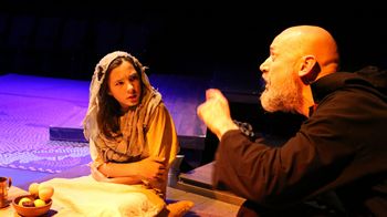 But wait, dial back to the first link in that chain of mixed blessings. The real Nicholas (and yes, there was a real Nicholas) lived in Asia Minor where he was Bishop of Myra in the third and fourth centuries and had no intention of fueling an economic engine. His intent was to give away his wealth, and then to inspire those who had more than enough to give their surplus to those facing destitution. Moreover, he endeavored to do so anonymously, stirred only by the tenets of love and charity gleaned in his upbringing as a Christian during the latter centuries of the Roman Empire, a time Christians were still viewed as a traitorous cult. Nicholas, written and co-directed (with Stephen O'Toole) by Jeremy Stanbary, takes the scant facts known about the real Nicholas, along with the account of his life passed on orally from generation to generation until recorded centuries later, and embellishes these with a fictionalized context in which his great work occurs. The result is a well-honed, powerfully presented play that draws us to the beliefs and behaviors that lie at the core of the frenzied holiday season we know today. It is both stirring and entertaining–the latter attributable to excellent staging, solid performances, bits of eye-winking contemporary references that sprinkle humor throughout, and beautiful music, both recorded, playing during scene transitions, and performed live by an outstanding young actor named Annie Birkholz. The play opens at a slave auction as a loathsome auctioneer uses his swaggering presence to pump up the bids being made for a young girl named Sophia. We are given short, alternating images, first of the leering auctioneer summoning up the worst instincts in men, then of the innocent girl singing "O Come, O Come Emanuel," an urgent appeal for a path to redemption from a life in bondage. After the two conflicting images meld, a hooded stranger appears and outbids the others to win the slave girl. Only, as we suspect from the start, he has not paid to have her as a slave, but to purchase her freedom, for he is Nicholas, Bishop of Myra. Until recently Nicholas had been imprisoned, along with other Christians, for refusing to pay tribute to the emperor in Rome, which they viewed as making a sacrifice to an idol. Freed after the installation of Constantine as emperor, Nicholas is on a mission to secure the girl's freedom, using the last bit of his inherited wealth to do so. The play veers back and forth between Nicholas' childhood, as he acquires values and inspiration to devote his life to doing charity and providing haven to those in distress in Jesus' name, set apart from friends who are adherents of the Roman pantheon of gods, and his current project, to win over the girl Sophia and inspire her to choose the path of mercy and charity for herself. In do doing, Nicholas' past and present come together in a way that is wholly satisfying dramatically. This construct is the fiction of the piece, yes, but it works well as a platform to reveal the nature of Nicholas and his legacy of pure generosity. The fictionalized elements provide a context to include the story of the three dowries to be related. According to the legend, Nicholas saves three impoverished sisters from being sold into slavery by anonymously providing sufficient wealth to make a dowry for each of them. And how is the wealth provided? In the dark of night, Nicholas tosses coins through their window, the coins landing in the sisters' stockings, hung up to dry. Jeremy Stanbary has a wonderfully charismatic presence as Nicholas, ably conveying the spectrum of emotions, from beatific peace to righteous anger, to empathic sadness, that punctuate the bishop's life. As the young Nicholas, Stanbary's own son, Augustine Stanbary, makes his debut in a mainstage Open Window production, having previously appeared in some of their youth theater programs. The younger Stanbary impressively depicts Nicholas' capacity to make sense out of his very difficult life, and to find meaning by following a spiritual path. Jeremy Darling plays both the slave auctioneer and Erasmos, father of the three dowry-deprived sisters. Darling creates vivid characterizations of both these deeply flawed men, with Erasmos having more depth as his character goes through a significant transformation. Annie Birkholz, in addition to singing beautifully in the opening, imbeds Sophia with fiery independence, keen curiosity and the capacity to accept change. She also plays young Nicholas' friend Zoe, conveying arrogance born of her family's extreme wealth and privilege. It is an impressive performance from this young actor. Another young actor, Wyatt Darling (the son of Jeremy Darling), appears as Nicholas and Zoe's friend, Kyros, and as Cyrus, the younger brother to the three sisters, who rails against his father's plan to sell the girls into slavery. Sarah Stanbary completes the cast, portraying Zoe as a teenager who has learned that wealth and privilege can be lost just as they can be gained, and as a much older Zoe, able to use the lessons learned in her life, to follow Nicholas' path of generosity and mercy. The cast appears to be a family affair, with six actors and three surnames, but everyone on stage delivers a performance that earns them the right to be there. The physical production given to Nicholas is excellent. The flexible performance space is arranged in a thrust formation for this production. Nate Farley's beautifully rendered scenic design, including a stunning mosaic patterned floor that incorporates symbols identified with Nicholas, is splendidly augmented by Jeremy Stanbary's projections. MaryBeth Schmid designed the costumes, which feel appropriate to the time period of the play and are effective in helping to tell the story. Olivia Lundsten's attentive lighting design and Jeremy Stanbary's sound design (the man's talents are abounding) are both well attuned to the needs of the play. With so much to admire in this play and i
