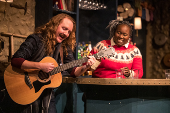 Though not in actuality an operational bar, you would never know it from the attention to detail lavished on Benjamin Olsen's beautifully designed set, including the view through the windowpanes out to the street, where snow is blowing about, giving a sense of urgency to those who pass through its portals into the warmth of The Local. Christmas at the Local is an opportunity to sit in a corner booth and watch longtime friends, with their musical instruments in hand, gather together to play and sing melodies that make one nostalgic for a holiday season spent in their good company, even if one never has had that experience before. It draws on something that feels elemental, a sentiment for a community that may never have been realized in our lives. The Local is the domain of its proprietor, played by Joy Dolo, radiating hospitality as she alternates between tending the bar and wiping down the counters, and joining in the festive song and storytelling. The storytelling is the centerpiece of the show, with Dolo's spirited recitation of Dylan Thomas' "A Child's Christmas in Wales," the friends gathered at The Local playing an evocative musical accompaniment composed by Cerys Matthews and Mason Neely in 2014. At various junctures, some of the others at the gathering contribute to the recitation, heartfelt remembrances of eccentric aunts and overstuffed uncles, shimmering snowscapes and simmering puddings, children bravely facing the dark-night frights conjured up by their imaginations. There are pauses as well, to give "the proprietor" time to tend to her duties, while the others assembled perform traditional Welsh songs, each aglow with vigor and warmth. Among those assembled at The Local is Jason Hansen, a superb piano player who also pitches in with guitar and mandolin. He is music director for the show, and also did the orchestrations and arrangements. The others at the party are all stellar vocalists, who, when they aren't singing, are playing an instrument. Phinehas Bynum plays keyboards, Spencer Chandler is on accordion, Bradley Greenwald on baritone horn to match his beautiful baritone voice, Elizabeth Reese plays flute and saxophone, Matt Riehle is on guitar, mandolin and percussion, and Quinn Shadko plays violin. I would be hard pressed to single any of them out, all are wonderful. Co-directors Larissa Kokernot and Peter Rothstein establish a wholly authentic atmosphere of friends gathered to share their musical gifts and sentimental longings, warming one another up on a cold night and welcoming the onset of the holidays with collective fellowship and artistry. There are some lighthearted dance steps and jaunty movement, though nothing that could be called full-out dance. There is never a moment that feels theatrical, as if reality is put on pause and the cast decide to put on a show. Without having to speak to one another (except in words whispered from one to another, unheard by the audience), this group of friends are so attuned to one another, they know when to join in, when to sit out, and when to effortlessly harmonize. After an informal opening, house lights on, during which the various participants are blown in from the outdoors, singly or in pairs, the program congeals around the first song, Paul Simon's "Getting Ready for Christmas Day," which combines the anticipation of great joy with a wink of mischief–the perfect note to kick thinks off. Among the other songs that precede the telling of "A Child's Christmas in Wales," "River" by Joni Mitchell, and "In the Bleak Midwinter," a poem by Christine Rosetti set to the music of Gustav Holst, are all movingly rendered. The Pogues' "Fairytale of New York" is a sweet blend of cynicism and sentimentality, while "Christmas at the Ale House," by the Irish Rovers, gets the tavern jumping. The evening closes with a reading of the poem "The Longing for Amazing Peace," by Dr. Maya Angelou, which she read at the White House Christmas tree-lighting ceremony in 2005, at the invitation of President George W. Bush. The poem is set to music by Chastity Brown that winds together her blend of Americana, folk and soul sounds, and was composed especially for this production. With proprietor Joy Dolo again holding the center, the poem, written in the wake of Hurricane Katrina, expresses the hope of drawing together people from all faiths, all nations, to arrive at a true and lasting peace, even beyond the absence of war. Brown's music perfectly suits the text, delivered with clarity and a sense of purpose. Beyond Olsen's terrific set, all other design elements are top notch, with Amber Brown's costumes seeming to match the personalities of the performers wearing them, comfortable, warm and with a bit of flair to acknowledge the approaching holidays. Abbee Warmboe's props provide the glassware and other accoutrements of a neighborhood bar steeped in tradition. Marcus Dilliard's lighting design adds to the burnished feel of the tavern and its growing warmth over the course of the evening. Christmas at the Local offers a calming evening that invites us to slow down and enjoy the company of those around us, as the assembled friends on stage enjoy their shared music and camaraderie, and let the peace that is the essence of the holidays wash over us, rather than manically darting about in search of its meaning. The music conveys a love of community, while the texts move from affection for the past to hope for the future. It is a lovely and lovingly presented holiday show. Christmas at the Local runs through January 1, 2023, at Theater Latté Da, Ritz Theater, 345 13th Avenue NE, Minneapolis MN. Tickets: $35.00 - $76.00. Student and educator rush tickets, $15.00, subject to availability, one hour before curtain, two tickets per ID, cash only. 20% discount for military personnel and veterans (up to four tickets). Members of Actors' Equity Association (AEA), the Union of Professional Actors; the Stage Directors and Choreographers Society (SDC); and the Tw