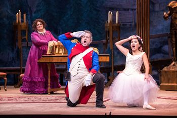 Whoa, don't get the wrong idea. This is not the plot of Mamma Mia! gone wild. The opera is set in the early 19th century in the Tyrolean Alps, where Marie was left on the stoop of a remote cottage as an infant, with a note asking the finder to take her in as their own. Well, she was found by an entire regiment of French soldiers who collectively raised her as their daughter. Of the regiment, though, it is Sergeant Sulpice, who first spied the babe in her basket, and he functions as the "lead" dad, if you will. Apparently, at that time, an entire regiment served together for decades without losing men or bringing on fresh recruits, so Marie has been nurtured and protected by this same gang of men all of her life, and they all take pride in considering her their daughter. Marie has grown to be a kind, lovely young woman, but raised in the army, she is a rough and tumble canteen girl. Removed from the company of other girls or women, she is every bit the tomboy, without a trace of feminine wiles. She experiences her first pang of womanhood when a handsome young man named Tonio catches her as she slips off a ledge. It is love at first sight. The regimental dads oppose Tonio, as he is of enemy birth, but Marie and Tonio make a persuasive case (with a boost from Donizetti's passionate score) for the authority of love over all else. However, a noblewoman, La Marquise de Birkenfeld, travelling through the region learns about the canteen girl Marie. She reveals that her sister abandoned a baby in just this place twenty years before–Marie is her niece! Once the family tie is proven, the Marquise declares she will bring Marie to her castle to train in the arts of feminine gentility, and find a suitable husband of noble birth. Marie and Tonio are devastated. At her castle, the Marquise's efforts to instruct Marie are going very badly, and the pressure is on as the Marquise has arranged a match between Marie and the princely son of La Duchesse de Krakenthorp, the highest ranked nobility in the district. To no one's surprise, we haven't seen the last of Tonio, Sulpice and the rest of the regiment and, miracle of miracles, it all ends happily. Donizetti's score is a treasure trove, with spellbinding arias for each of the lovers, as well as a rhapsodic duet. Among these, Tonio's aria in Act Two, "Ah! mes amis, quel jour de fête!," is a well-established crowd pleaser, powerful enough to break the Marquise's resolve and move her to grant Marie's hand to Tonio. A joyful trio celebrating the reunion of Sulpice, Marie and Tonio–"Tous les trois réunis"–is another favorite. Jaunty marching and melodies are given to the men of the regiment, bringing vigor that strikes a balance with the romanticism of the arias and duets, and the regiment's anthem, "Chacun le sait, chacun le dit," is a comic delight. There is very little recitative and more spoken text between musical pieces than is customary in opera, as if Donizetti anticipated the emergence of operetta several decades later Maestra Kelly Kuo conducts the stellar Minnesota Opera Orchestra, fifty members strong, in a stirring presentation of the score, not only accompanying the soaring vocals, but providing an aural environment, from the blare of cannon fire echoing in the hills to the gentle twitter of early morning birds. The stage direction by John de los Santos mines the comedy inherent in the work, with wonderfully staged bumbling among the soldiers and clowning by Marie as she displays her tomboy nature, even in the midst of a ballet lesson. De los Santos also choreographed, creating a lovely bit for the other ballet students whose grace is pitted against Marie's awkwardness, along with dance sequences for the men of the regiment, the townspeople celebrating the departure of French forces early on, and the guests at the would-be wedding of Marie and her high-born groom. Vanessa Becerra is a treasure as Marie, her soprano beautifully delivering her many solos, and her comedic flare and physicality perfectly suited to the tone of this work. David Portillo, as Tonio, brings a magnificent tenor to his arias, drawing cheers from the audience every time, and his fresh-faced presence brings out the innocence and earnestness of his love for Marie, a love that far outweighs any loyalty to nationality. The two sound glorious in their duets together. Andrew Wilkowske, a Minnesota Opera Resident Artist alum, is terrific as Sulpice, stalwart in his command post but able to be playful and sympathetic with Marie, and his bass gorgeously delivers his musical assignments. La Marquise de Birkenfeld is played by Margaret Gawrysiak, bringing out the character's self-absorbed nature and skillfully presenting the musical segments with a distinct contralto. The role of her steward, Hortensius, is performed by Jeremiah Sanders, a current Minnesota Opera Resident artist, does well with the humor embedded in this put-upon character through his stirring bass voice and physical bearing. La Duchesse de Krakenthorp was intended by Donizetti to be a non-singing role, and often a well-known personage is cast here, allowing for a sparkling cameo performance. This production certainly goes with the sparkle, casting writer, singer, producer, and drag queen Monét X Change, a double-crown winner on "RuPaul's Drag Race," as La Duchesse. Because Monét X Change does have an operatic voice, an aria was inserted for the character, taking a detour from the standard libretto but earning a great ovation from the appreciative audience. (For what it's worth, this is the second production in the Twin Cities in less than a month to feature a veteran of "RuPaul's Drag Race" in the cast, following the national tour of Hairspray with Andrew Leavitt as Edna Turnblad.) La Duchesse is also given a unique costume treatment by Trevor Bowen, taking its cue from the overall esthetic of the piece–Zach Brown's and Timm Burrow's exaggeratedly ornate mid-19th century central Europe, with somewhat comical