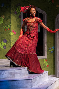 For decades many viewed Hello, Dolly! as a musical for our parents' generation and emblematic of "old school," arriving in 1964 and set at the turn of the century (that's 19th to 20th century). There was a megaton of chatter about the 2017 Broadway revival but, come on, would that production have been a sensation had it not cast the inimitable Bette Midler in her first–and likely last–ever lead Broadway musical role? Even so, perhaps that attention to the Jerry Herman (music and lyrics) and Michael Stewart (book) work drew Theater Latté Da to consider how it would look on stage in their intimate Ritz Theater. Whatever prompted making Hello, Dolly! the centerpiece of their 2022-2023 season, it was a terrific decision, and its realization is a cause to celebrate. Hello, Dolly! may be well worn, but it is not a bit tired, at least not in Latté Da's reliable hands. Herman's score is tuneful and cheery. Every number can be easily hummed or whistled, for those so inclined. Moreover, it is unstintingly optimistic. The one song that could be described as "quiet," the yearning, "Ribbons Down My Back," sweetly expresses the hope of finding love. Not one of the show's dozen-plus songs summons a dark thought. Doesn't that sound like a welcome elixir? It is also very funny, with humor that stands the test of time because it is not topical, is not tied to current events or societal trends. Hello, Dolly!'s bright humor is based on the temperament of its characters and on comically devised situations, most of which are drawn directly from Thornton Wilder's 1954 play The Matchmaker, on which the musical is based, skillfully transferred into Stewart's book and given every opportunity to sail off the stage in this production. The original 1964 Hello, Dolly! was directed and choreographed by an inspired master of both, Gower Champion. Latté Da's production is likewise under the helm of a director-choreographer, Kelli Foster Warder. The blending of those two key jobs makes utmost sense in this show. A musicality wafts in the air, even when not a note is being played, and continuous attention to movement, even when it is not dance, allows the narrative to seamlessly, giddily glide forward. This brilliant work by Warder follows on the heels of her exquisitely staged Jelly's Last Jam at Latté Da last spring. Another element of Latté Da's success is its casting, starting with Regina Marie Williams as Dolly Levi. Williams, we all know, has the throaty voice and presence to pull off a showstopping first-act closer like "Before the Parade Passes By," the coy "I Put My Hand In," a vibrant waltz ("Dancing"), a sashaying eleven o'clock number such as "So Long Dearie," and the anthemic title tune, complete with a regal entrance and descent down a set of stairs. That, owing to Latté Da's small scale, those steps number only three, matters not–Williams and company make it a ravishing occasion. What some may not have seen before are her comic chops, which she does not as often get to display. She vibrantly delivers the rich humor, while also maintaining the warmth that makes Dolly such an irresistible character. And yet, Williams brings an unusual depth of poignancy to Dolly's one-sided conversations with her deceased husband Ephraim, explaining why she must move on with her life and asking for his blessing. Dolly's comic foil, a tight-fisted merchant of Yonkers, New York, named Horace Vandergelder, on whom she sets her matchmaker's eyes right from the start, is played by T. Mychael Rambo, an actor known for his warmth and gentility, which means he is stridently cast against type. Vandergelder only sings twice–early on, expressing his male chauvinist view on marriage, and at the end, in a tenderly realized reprise of "It Only Takes a Moment." Between his first blustery appearance and his closing besotted moment on stage, Rambo animates Vandergelder's arc, showing his resistance to the force of nature that is Dolly Levi dissolve inch by inch; it is a charming, altogether winning performance, while allowing Rambo to share his swell voice at least briefly with the audience. Typically, golden age musicals have a "second couple," whose romantic travails provide filagree around the central plot. Hello, Dolly! goes all out, with three such couples. There is Vandergelder's naive head clerk Cornelius Hackl (Reed Sigmund), who rebels against the tranquility of Yonkers to finally experience adventure by hopping the train to New York City with the even more naive assistant clerk Barnaby Tucker (Brian Kim McCormick) in tow, cuing up one of the most happily hopeful production numbers in all the wide world of musical theater, "Put on Your Sunday Clothes." The two young men find their adventure by seeking shelter in a millinery shop where they meet milliner Irene Malloy (China Brickey) and her assistant, Minnie Fay (Anna Hashizume). All four actors are fabulous in their respective roles. Brickey sings the aforementioned "Ribbons Down My Back" beautifully, and Sigmund brings his brilliance for physical comedy (honed in his abundant work at Children's Theatre Company) to the intrepid Cornelius. Vandergelder's weepy niece Ermengarde (Janely Rodriguez) and her struggling artist boyfriend Ambrose (Riley McNutt) are the third couple, struggling to overcome Uncle Horace's opposition. Both Rodriguez and McNutt are fine actors and singers who bring heart to these smaller roles. Along with all of the above, Twin Cities veteran actor Sally Wingert gamely pops up in about a half dozen roles, from a would-be match for Vandergelder, Ernestina Money, to snooty chef to municipal court judge, drawing laughs with some of the disguises those parts require. Dance couple Elly Stahlke and Kyle Weiler are given numerous opportunities to embellish Herman's score with balletic choreography. Along with ensemble member Brian Kim McCormick, Stahlke, Weiler and Wingert form a spirited ensemble, often supplemented by other cast members taking on various