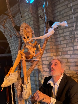 Sommers' work is laced with a dry sense of humor (with detours into puns and riddles), a dreamy-eyed view of the human journey through life, and a feeling of melancholy tempered with hope. To see his work is to have some indication of the mind and soul of the artist. In Sad Song Sing Along we find him cogitating the inner turmoil–the "hum" he calls it–that creates a restlessness among the human species, shearing us from our natural essence and equanimity. Sad Song Sing Along is divided into three segments, all brief; the show's total run time is about 50 minutes. In the first segment, the audience, limited to fifty, assembles in the theater's small lobby–standing, but seats are available if needed. A costumed Sommers emerges from an elaborate disguise to present a sort of self-help seminar, opening with the statement that "You are all miserable," spoken not as a denouncement but as an ordinary fact. He elaborates on the source of our collective misery and how we might regain, or perhaps for the first time gain, contentment. He uses wordplay, both verbal and visual, that goes from that "hum" to "human" to "humility" to "humble", that we might find ourselves more grounded in life on this earth. This is delivered by Sommers with his distinctive voice that combines a sense of gravitas with merry whimsy. Sommers calls on Brandon, who responds in an amplified voice from on high (actually, stage manager and co-conspirator in the show, Brandon Sisneroz). Brandon's patient tone of voice seems to show that he has learned to humor Sommer's idiosyncrasies and take the part of a straight man to Sommers' philosopher clown. We continue to stand through the second segment (the transition amusingly accomplished), to be instructed by a marionette named Darren who teaches us to sing the aptly titled "Sad Song" and we gamely oblige, singing along. It is easy to learn, and vocal ability is definitely not needed, for even I could master it. Darren/Sommers has fun with their audience participation segment. For the third segment, the audience finally takes their seats, silently directed by a glum looking traffic cop, and the performance shifts to the stage. Brandon takes on the role of narrator here, introducing us to Enoch, whose dream encompasses the tree-bound, cigarette-smoking prophet Nicodemus endlessly twirling round and round, as well as dart throwing and balloon dropping, with a spinning tabletop, hanging burdens, toy unicorns, a fluffy rabbit, and other assorted trappings. Exactly what that last segment means is hard for me to say. I was right on board with the opening bit about "the hum," and happily sang "Sad Song" (the contradiction there is part of the great fun), but while the business upon the stage is brightly imaginative and intriguing, I would be hard pressed to tell you what it all means. Though I did speculate on what it might mean, I am pretty unsure that my thoughts on the matter are anything more than, well, my thoughts, and not necessarily akin to Sommers' thoughts–though that may be precisely what he has in mind for us. In any case, Sad Song Sing Along offers an opportunity to view the wistful, whimsical, and amazingly inventive work of a premiere theater artist, and to be stimulated to ponder things that may rise above the where-to-go-for-dinner, how-much-to-sock-away-in-the-IRA, or who-will-win-the-Oscars-this-year kinds of questions that occupy so much of our time. It is a journey with fellow travelers who are keen for this type of artistry. If you count yourself among them, or if you are not certain but open to finding out, I encourage you to see for yourself. Just don't blame me if the "Sad Song" tune continues to fill any empty space in your mind for the next few days. Sad Song Sing Along runs through February 14, 2023, at Open Eye Theatre, 506 East 24th Street, Minneapolis MN. Tickets: General Admission: $18, Students and Seniors: $15, Economic Accessibility: $10. For tickets and information, please visit openeyetheatre.org or call 612-874-6368. This production is recommended for ages 14 and up. Created and Directed by: Michael Sommers; Costume and Prop Design: Michael Sommers; Lighting and Sound Design: Michael Sommers and Brandon Sisneroz; Stage Manager: Brandon Sisneroz. Performed by: Michael Sommers, featuring Brandon Sisneroz. |