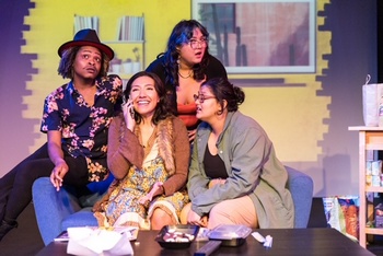 Code You captures the panic and despair that was heavy in the air at that time, and the longing for it to all go away with a finger-snap and for everything to be put back as it was. In hindsight we know that there are accommodations and different ways of organizing our social spaces and interactions that will probably stay with us. But who does not recall imagining that one day–very soon, we fervently hoped–we would wake up to read the headlines "Pandemic Over, Everything Back to Normal"? That is, in a sense, the gist of Patterson's play. Marlen enters her small apartment looking totally wiped out. She drops her backpack heavily on the floor, sets a paper grocery bag down on her counter and cleans up empty takeout food containers and disposable cups with the gloom of knowing that there will soon be more, just like those, life reduced to an endless round of making a mess and tidying up. She looks out her window and then makes a call to her parents, who are still parked in front of her apartment building, having just dropped her off. She tells them that she made it inside fine, they can go home now. There is some odd business involving an order of take-out sushi mysteriously dropped off outside Marlen's door. We watch her wipe down the containers with Clorox sanitized wipes, thinking oh man, it feels so long now since we did that every time we brought something into our homes ... and at the time, it felt like we'd been doing it for so long, so weary were we all of the tedium of it. She makes a stab at watching TV, which shows up as a projected image on the rear of the stage. Things pick up when a trio of Marlen's besties–Danny, Jai and Jessica–arrives unexpectedly, ready to party with her. There are no masks, social distancing, or worries about germs. When Marlen lectures them about why they should be worried, they think she has lost it. Instead, they prevail on her to call and invite Juan, a boy Maren was seeing whom she had ghosted–though, in the throes of a pandemic, who feels inspired to invest in new relationships? This interplay between COVID-weary Marlen and her carefree friends continues, dishing out a lot of funny banter along the way, especially about how absurd our pandemic behavior would have seemed to someone who had not understood the grave need for it. It concludes with a surprise ending that, truth be told, is not that hard to anticipate. It comes somewhat abruptly, making clear the sense behind everything we have just seen, and turns the gaiety of what we have just witnessed into an inevitable sorrow. If Code You ends on a down beat, it also allows for a great amount of well-conceived humor, a time-honored way of coping with whatever troubles come our way, in the vein of "laughter is the best medicine." Patterson has taken a clever notion and spun it into an engaging and very funny vignette. The play feels like it could be further developed. Exciting news about Marlen receiving a check for a piece of published writing goes nowhere, and there is no follow-up on the source of the mysterious sushi. Patterson makes the effort to be sure we know early on that Marlen is Latinx, but her ethnicity or a cultural perspective does not seem to make any difference to what follows. If anything, the culture depicted through most of the play is a culture of youth, built around partying, social media, drinking, and binging on Netflix. Given the loose ends, what is currently on stage could serve as grist for a longer, more fully realized piece. If the play calls for further development, director Patterson makes the most of its present form, juxtaposing the incontestable heaviness of the pandemic with a flippant, surrealist imagining that none of it is real. The simple set is very well conceived. Its furnishings look like they came out of a Wayfair catalog, which is pitch perfect for this young adult crowd. Costume designer Simone Bernadette Williams has dressed each of these characters with a perfect sense of their backstory, and as prop master, they provides all the gear that a twenty-something in a small apartment is likely to have on hand. Peter Morrow ably designed the projections, which initially seem like a way of simply expanding on the urban environment, but gradually we realize they are an integral part of the narrative. Morrow's sound design and Mitchell Frazier's lighting design also contribute to the excellence of the production. Julia Isabel Diaz wonderfully brings the central character of Marlen to life, cycling through a range of emotions from gloomy tedium to anxiety to giddiness to romantic abandon to fearful despair. We always have the sense that this is just how a real person in the same situation will act. José Sabillôn is completely winning as shy, eager-to-please Juan, elated at the good fortune of another chance to make a connection with Marlen. The pair also look great together, which helps to bring authenticity, as their relationship seems ready to move onto new ground. Emmanuel L. Woods is hilarious as Danny, the mastermind of the partying taking place in Marlen's apartment. He has a sassy, finger-snapping confident air of always knowing the right next move. Ankita Ashrit and Johanna Keller Flores do excellent work as the rest of the crowd, game for whatever Danny proposes and mildly disputing each other's claims of being Marlen's best friend. Code You is a smart, funny, insightful play, albeit one that at present feels slight. It does plant seeds that, with additional cultivation, could ripen into a much fuller play. Exposed Brick has provided the TLC to give the play a sparkling presentation that entertains and stimulates discussion, which are two of the best things any play can do. Exposed Brick Theatre's Code You runs through February 26, 2023, at Dreamland Arts Theatre, 677 Hamline Ave. N., Saint Paul MN. Tickets: $22.00, students and artists $15.00. Tickets are available at dreamlandarts.com/codeyou. For information about Exposed Brick Theatre, pl