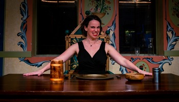 Well, not exactly. Feast, by Megan Gogerty, is presented as a dinner-theater event at Black Forest Inn, the long-standing German restaurant in the heart of Minneapolis' "Eat Street" district. Not a typical theater venue, it lacks stage lighting or even a stage, but so what? Dinner is served first, with a choice of entrees ordered in advance, and live music performed by either Scott Keever or the trio Sycamore Gap, alternating dates. Both are in the vein of Celtic/Nordic/Gaelic folk music. Then the play begins. Feast is a one-woman affair performed by Isabel Nelson, known to me primarily from her extensive work with Transatlantic Love Affair, creating exquisitely conceived physical theater pieces. Lights dim, Nelson enters, or more accurately crawls, barely a human being at first, more a lump of sludge that manages to reach a long table set in the middle of the open playing area. There she squirms, grunts, pulls limbs, twists appendages, cranks, and manages to transform herself into a person–actually a charming, lovely to look at person in a breezy black dress. Holding her arms out, curling her lipsticked mouth into a smile, she gushes "I've arrived!" Only then do we realize that she is the host of the meal we are just finishing up. Her invitation was to dine, yes, but also to serve as a "truth and reconciliation" council, listening to her outrageous account of how she, the mother of Grendel, murdered the legendary hero Beowulf. It is a confessional that transitions into a call to arms. And it is decidedly not ordinary theater. The Beowulf of legend slayed the monster Grendel, depicted variously as a sub-human creature, a descendent of Caine, the first murder according to the Bible. Beowulf pulled one of Grendel's arms off of his body and hung it on the wall, like a hunter's trophy. Grendel's mother rises up from her mud-cave home at the bottom of a lake to avenge her son's death and rebuke the arrogance with which the killer displayed his prize. She intends to have vengeance and justifies everything she does to achieve it. She tells us, never doubting herself, "sometimes it's okay to desecrate a body." Grendel's mother relates her perspective on the struggle between Beowulf and her son, and then her own battle against Beowulf. Along the way, we somehow veer into the question of when is it right to rage against power. Our host cites statistics about the relatively small number of billionaires on Earth (about 2,700), whose combined wealth enables them to control the other nine billion human beings on the planet. Her case for their overthrow is cogent, and her lack of a deeply imbedded moral code (she is, after all, a sea hag) makes her suggestions seem, within that context, utterly reasonable. As she earlier stated, describing the futility of Grendel's efforts to argue his case against Beowulf using logic, "you can't negotiate with a mosquito." And yet, how do we come to classify other human beings as mosquitoes? Feast runs about 75 minutes–that includes a brief pause while a modest dessert is passed out to the audience–and for its entirety, Nelson holds our focus. Gogerty, who is both a playwright and a comedian, fluctuates the play's tone between the raging confessions of a deranged sea hag and the bitterly funny commentary of a loquacious woman who might be sunbathing in the next deck chair. An example of the latter: in her continued efforts to cast aspersions at Beowulf, she drolly announces, "and get this: he's not even from here!" Nelson gives a remarkable, mesmerizing performance, physically as well as mentally engaged every moment, comical one minute and raging with venom the next. All I can say is "Wow!" Allison Vincent directs the piece, and I couldn't begin to tell where the director's work ends and the actor's picks up, but as Vincent is a fellow veteran of Transatlantic Love Affair, I am guessing their collaboration is exceedingly fluid. Richard Graham designed sounds that add color to the spoken descriptions, such as the clatter of a noisy ale room occupied by warriors celebrating their success. Whittney Streeter designed what are called "special props," which I assume includes the sea hag's oversized glowing heart, which, she determines, causes her to love too much. For $20 less per ticket you can opt to attend only the play and skip the meal that precedes it. However, partaking in the meal provides the sensation of having been summoned by Grendel's mother–who, by the way, was never given a name in the ancient texts, simply called "Grendel's mother"–to sup and then to assuage her fiery swirl of guilt and anger, feels like a cohesive whole. Besides, the food is excellent, with a vegetarian and a gluten free option available. For those who want an even more complete account of the Beowulf/Grendel saga, Walking Shadow offer an opening act, its one-man production of Beowulf, an adaptation by Charlie Bethel, directed by Amy Rummenie and performed by Walking Shadow's artistic director John Heimbuch. It plays at 5:00 p.p. on March 18, March 25 and April 1 at the Black Forest Inn. I saw their Beowulf via a performance offered on Zoom in the first months of the pandemic and can heartily recommend it. There is a separate pick-your-price ($15, $20, $25) ticket charge. With Feast, Walking Shadow once again pushes the boundaries of what an evening of theater might be like. Their on-stage feast is pungent and saucy, nourishing, intoxicating, and utterly satisfying. Feast, a Walking Shadow Theatre Company production, runs through April 1, 2023 at the Black Forest Inn, 1 East 26th Street, Minneapolis MN. Tickets: Dinner and Show - pick your price, $55, $60, $65. Show only - pick your price, $20, $25, $30. For tickets and information, please call 612-375-0300 or visit walkingshadow.org. Playwright: Megan Gogerty; Director: Allison Vincent; Sound Designer: Richard Graham; Props Designer: Whittney Streeter; Dramaturg: Gina Musto; Stage Manager: Brian Hir; Dinner Music: Scott Keever a